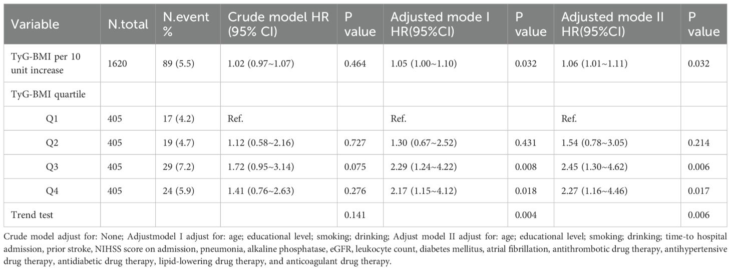 After 1 year of follow-up, 181 participants either withdrew or were lost to contact, resulting in a final analytic cohort of 1,620 individuals (978 men and 642 women) with a mean age of 65.2 ± 11.5 years. The baseline demographic, clinical, and laboratory profiles were stratified and compared according to TyG-BMI quartile (Q1–Q4), as detailed in Table 1. There were significant differences in age; educational level; BMI; DBP on admission; heart rate; presence of co-morbidities, including diabetes mellitus and atrial fibrillation; NIHSS score; blood parameters, including total cholesterol, TG, HDL cholesterol, LDL cholesterol, FPG, TyG, alanine aminotransferase, eGFR, uric acid, leukocyte count, INR; Pharmacotherapy information, including antidiabetic drug therapy and lipid-lowering drug therapy among different TyG-BMI levels (P < 0.05). In addition, we further divided the patients into two groups based on 1-year stroke recurrence (with stroke recurrence and without stroke recurrence) and described and analyzed their baseline clinical characteristics (Supplementary Table 1). The results showed that age, heart rate, NIHSS score on admission, walking within 48 hours of admission, pneumonia, prior stroke, atrial fibrillation, FPG, alkaline phosphatase, homocysteine, eGFR, blood urea nitrogen, leukocyte count, and antithrombotic drug therapy showed significant differences between the two groups.