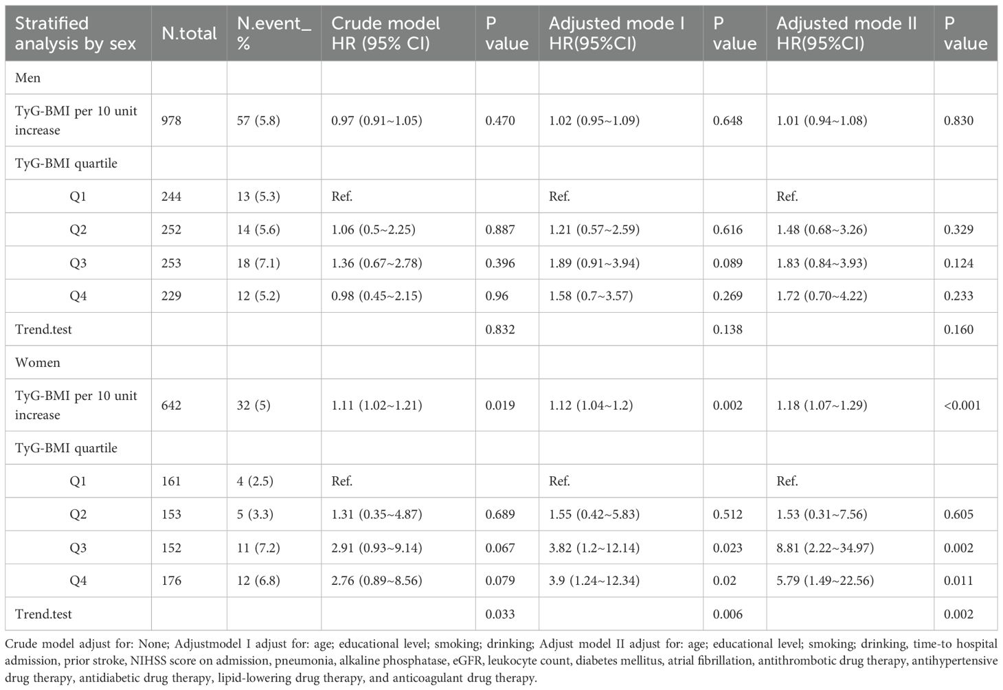 In patients with AIS and hypertension, Cox regression stratified by sex revealed a significant divergence in TyG-BMI association with 1-year stroke recurrence risk (Table 3). Among men (n=978), neither the continuous TyG-BMI (per 10-unit increase: adjusted HR = 1.01, 95% CI 0.94–1.08, P = 0.830) nor the quartile-based analysis (Q4 vs. Q1: adjusted HR = 1.72, 95% CI 0.70–4.22, P = 0.233; P for trend = 0.16) demonstrated statistical significance after full adjustment for covariates (age, lifestyle, comorbidities, and clinical indices). Conversely, in women (n=642), each 10-unit TyG-BMI increase markedly elevated the risk of 1-year stroke recurrence (adjusted HR = 1.18, 95% CI:1.07–1.29, P < 0.001), with quartile analysis demonstrating a robust dose-response effect: Q3 (HR = 8.81, 95% CI 2.22–34.79, P = 0.002) and Q4 (HR = 5.79, 95% CI 1.49–22.56, P = 0.011) vs Q1, alongside a significant trend (P for trend = 0.002).