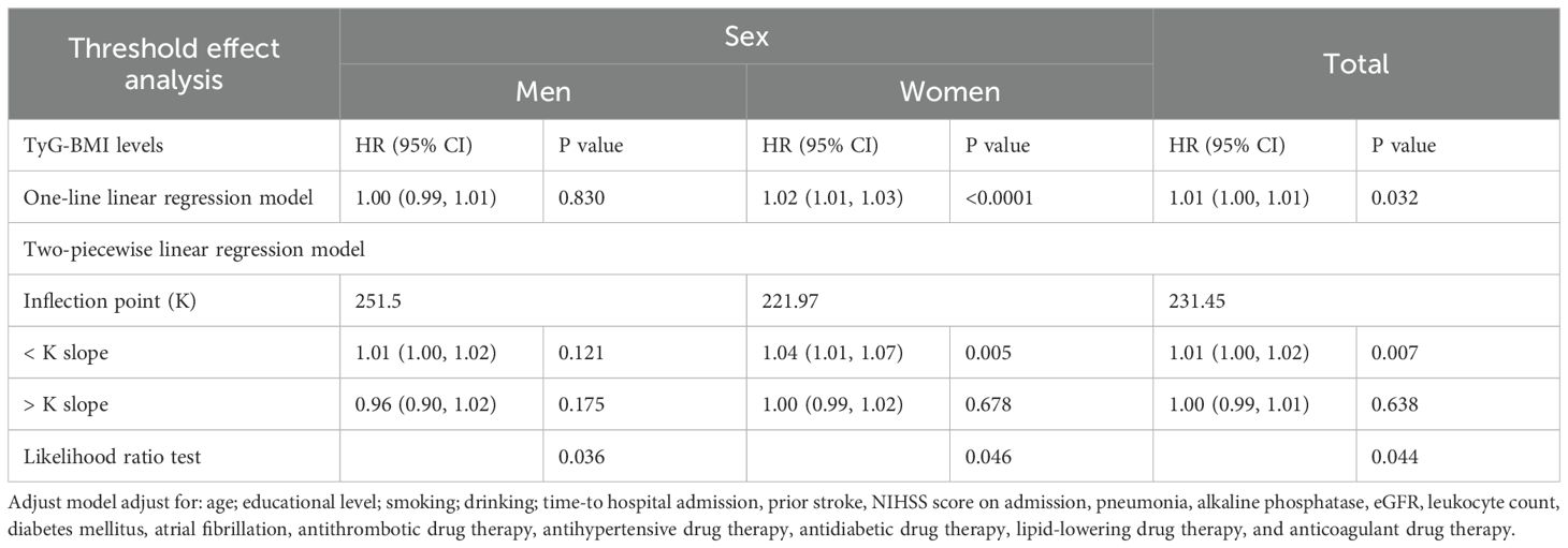 Prior studies have demonstrated a nonlinear association between TyG-BMI and stroke risk, identifying a statistically significant threshold effect at TyG-BMI = 174.63 (31). Below this threshold, each 10-unit increment in TyG-BMI was associated with a steeper risk increment (HR = 1.144, 95% CI: 1.044–1.253). Conversely, above 174.63, the risk impact attenuated substantially (per 10-unit increase: HR = 1.038, 95% CI: 1.016–1.061). Consistent with our findings, this observation confirms a nonlinear association of TyG-BMI with 1-year stroke recurrence risk. Our study identified a statistically significant threshold effect for TyG-BMI at 231.45 in the overall AIS cohort. Below this threshold, each 1-unit increase in TyG-BMI was associated with a more pronounced increase in risk (HR = 1.01, 95% CI 1.00–1.02). Conversely, above 231.45, the impact on risk was substantially attenuated (per 1-unit increase: HR = 1.00, 95% CI 0.99–1.01). To further explain the details observed in the threshold saturation effect, we divided the patients into two groups: TyG-BMI < 231.45 and TyG-BMI ≥ 231.45, and compared their clinical characteristics. The results revealed that the TyG-BMI < 231.45 group had a higher proportion of older patients, a higher incidence of atrial fibrillation, and a lower proportion of patients receiving antidiabetic drug therapy and lipid-lowering drug therapy. We found that the risk of recurrent stroke at 1 year in the TyG-BMI < 231.45 group might be associated with these clinical characteristics. Clinicians should consider these factors when providing targeted interventions, which may effectively reduce the risk of recurrent stroke at 1 year (Supplementary Table 2). Unlike previous investigations, our subgroup analyses revealed a significant sex-specific threshold for TyG-BMI. Specifically, the piecewise regression analysis revealed that among females with a TyG-BMI below 221.97, each unit increase in TyG-BMI was associated with a significantly greater increase in the risk of 1-year stroke recurrence compared to those above this threshold (adjusted HR = 1.04, 95% CI 1.01–1.07, P = 0.005). These findings indicate the need for sex-tailored metabolic management strategies and highlight TyG-BMI as a promising prognostic indicator.