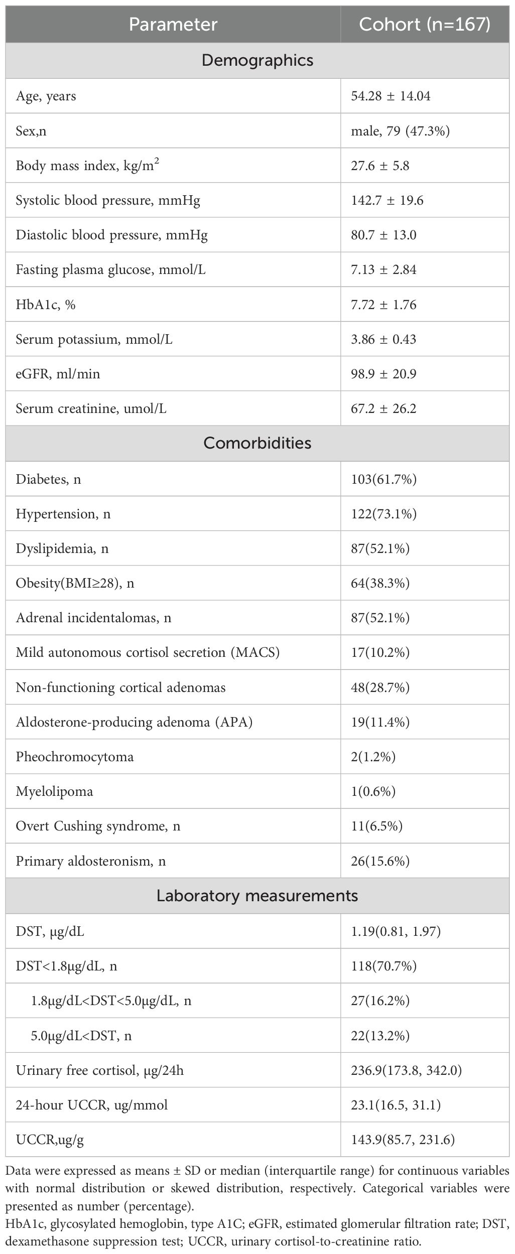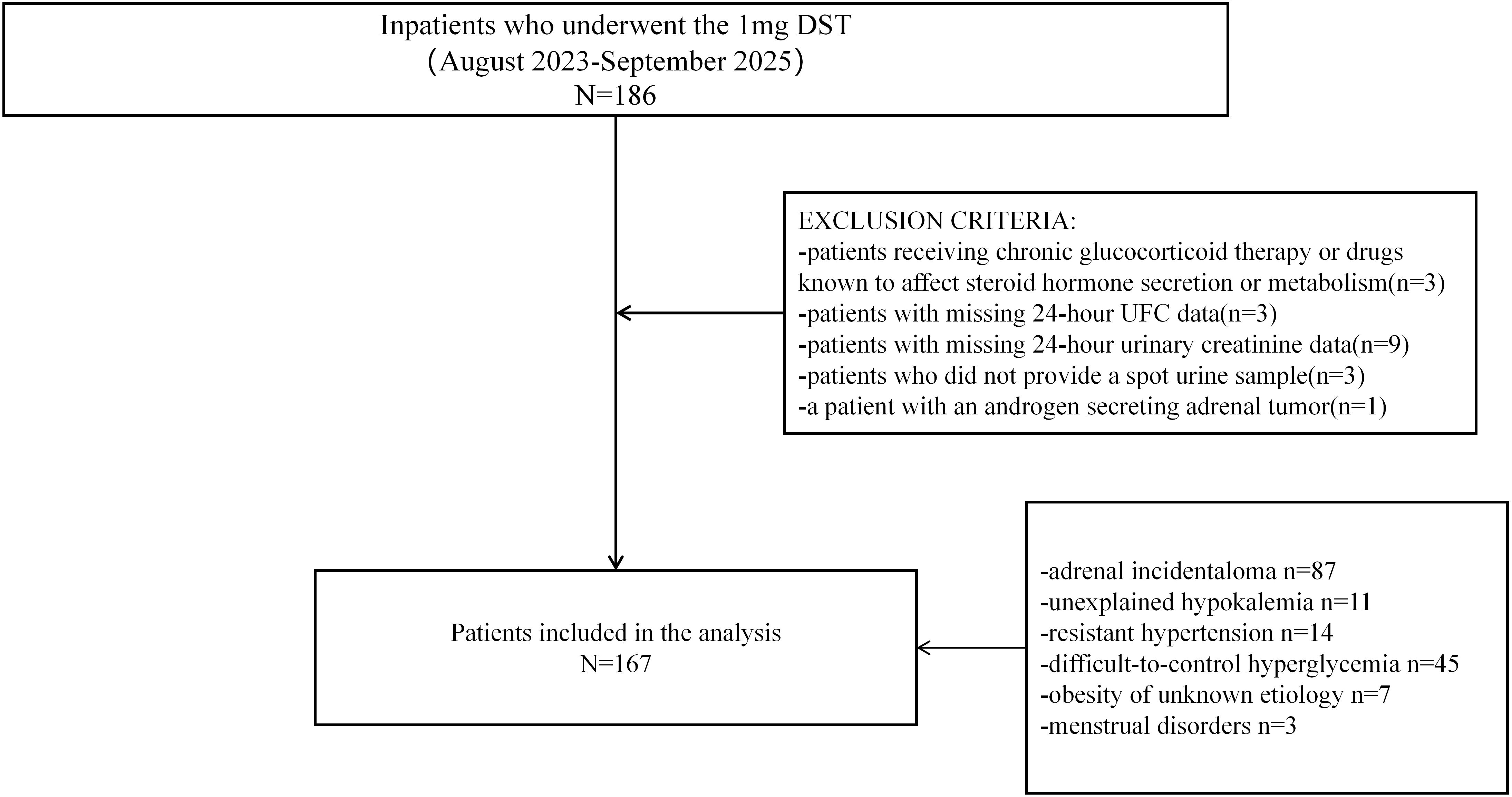 This cross-sectional, single-center study was conducted at the Department of Endocrinology and Metabolism of our hospital. Individuals admitted to the inpatient ward of the Department of Endocrinology and Metabolism between August 2023 and September 2025 who underwent the 1mg overnight dexamethasone suppression test (1mg DST) were initially recruited for the study. Indications for 1mg DST included incidentally discovered adrenal masses, clinical features suggestive of Cushing’s syndrome (e.g., centripetal obesity, wide purple striae), suspected primary aldosteronism, resistant hypertension, difficult-to-control hyperglycemia, and unexplained hypokalemia. We excluded patients receiving chronic glucocorticoid treatment or drugs known to affect steroid hormone secretion or metabolism. Additional exclusion criteria included patients with missing 24-hour urinary creatinine or 24-hour UFC data, as well as those who did not provide a spot urine sample. A patient with an androgen secreting adrenal tumor was also excluded to avoid potential analytical interference. In total, 167 patients were included in the cohort (Figure 1).