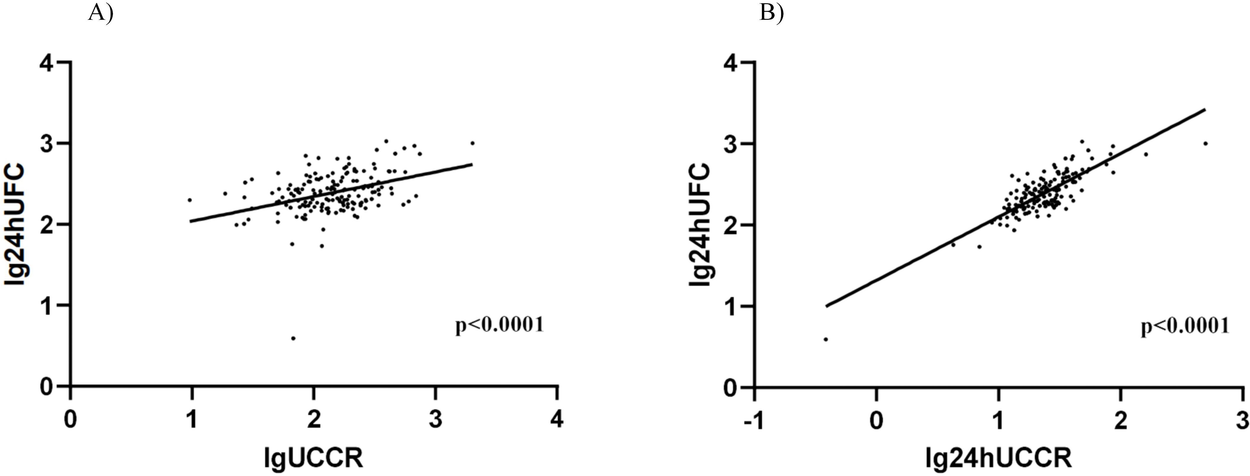 All participants underwent 24-hour UFC, 24-hour UCCR, and morning spot UCCR tests, so we performed a linear association analysis. Both morning spot UCCR (B = 0.303, P < 0.0001; Figure 2A) and 24-hour UCCR (B = 0.780, P < 0.0001; Figure 2B) exhibited a significant correlation with 24-hour UFC.