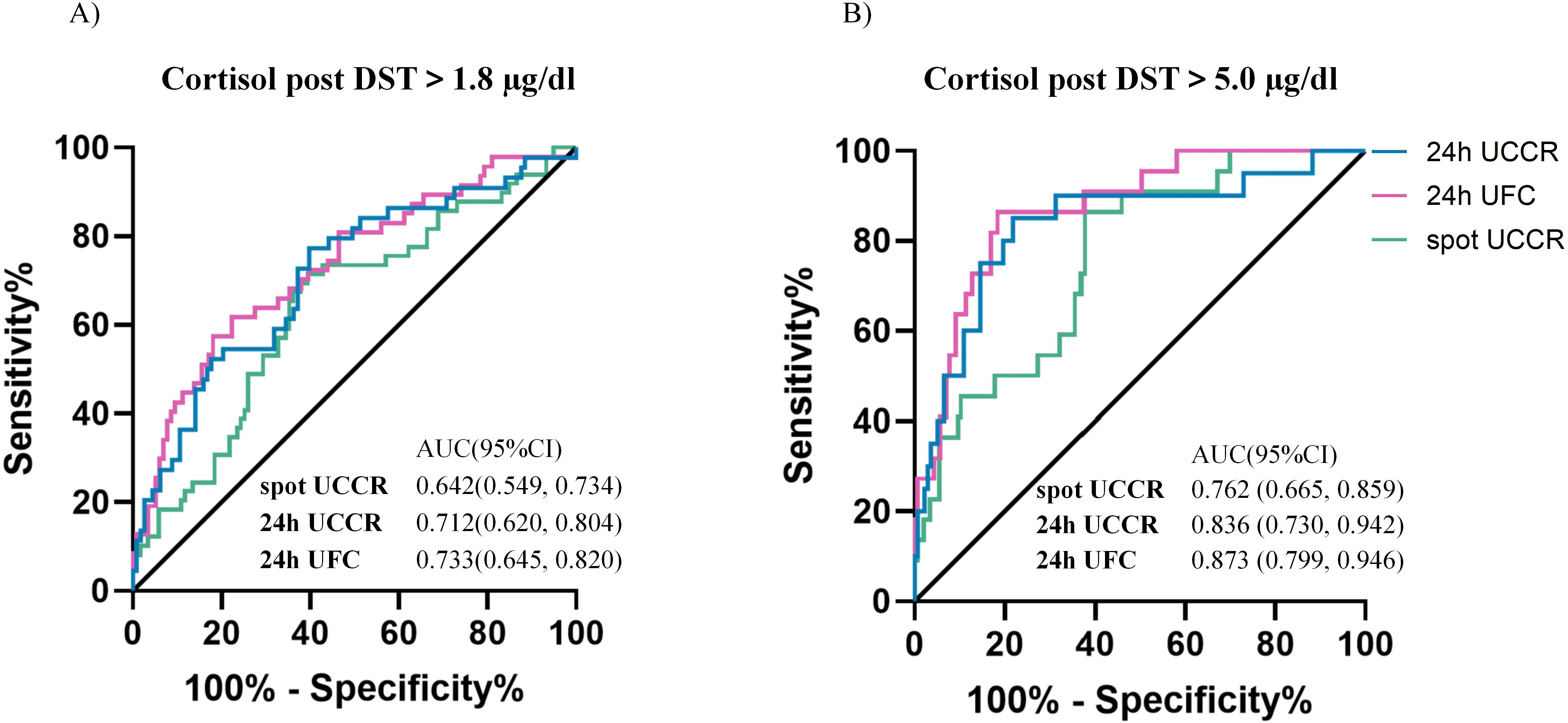 Figure 3. Diagnostic performance of urinary cortisol tests. ROC curves of morning spot UCCR, 24-hour UCCR and 24-hour UFC for predicting cortisol post 1mg DST >1.8 µg/dL (A) and >5 µg/dL (B). Area under the curve (AUC) with exact binomial 95% confidence intervals (95% CI) were calculated. Solid lines represent the reference (AUC = 0.5, no discrimination). DST-dexamethasone suppression test; UCCR-urinary cortisol-to-creatinine ratio; UFC-urinary free cortisol.