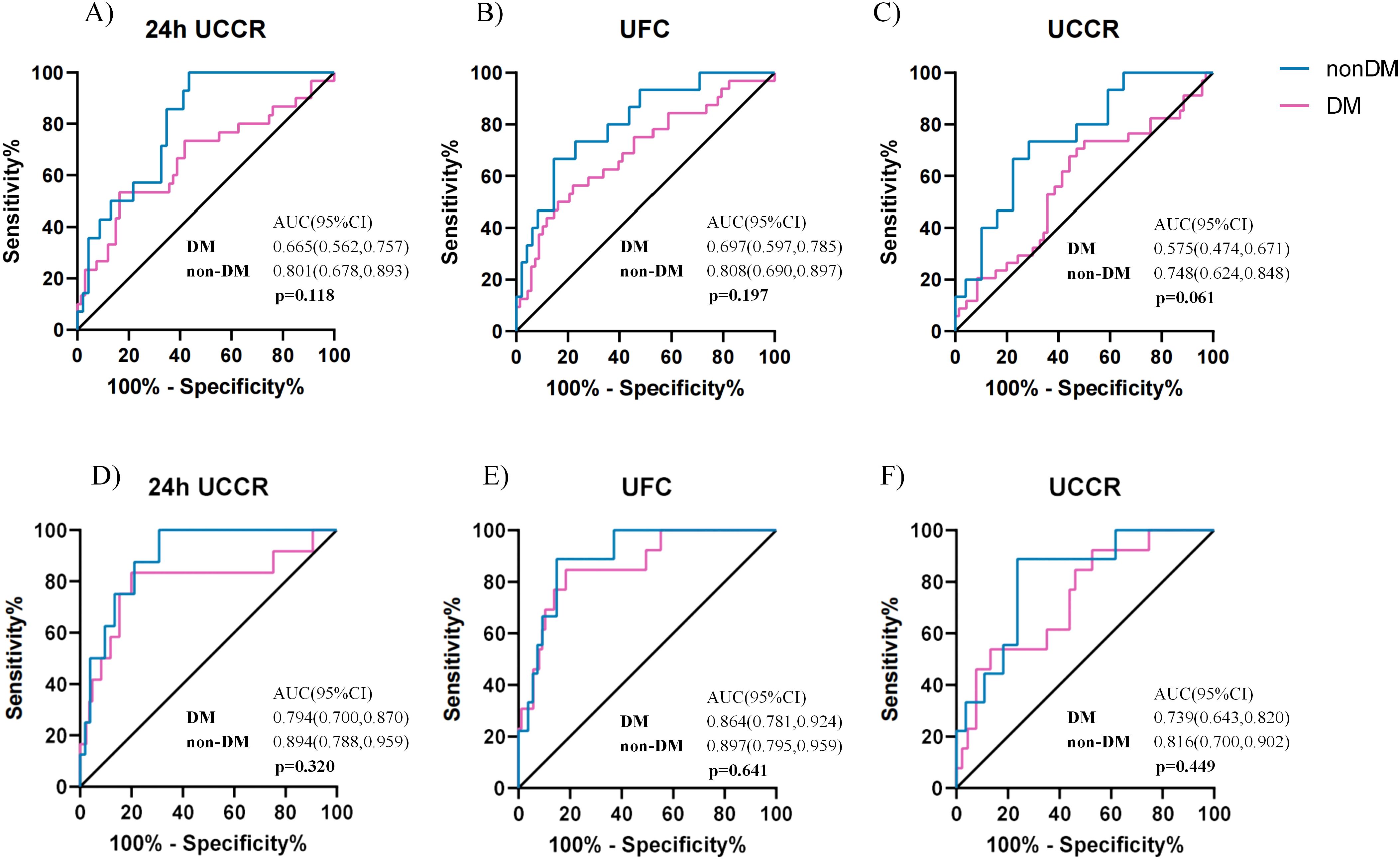 Figure 4. Comparison of diagnostic performance of urinary cortisol tests in patients with or without diabetes. ROC curves for spot UCCR, 24-hour UCCR, and 24-hour UFC in predicting cortisol post DST >1.8 µg/dL, stratified by diabetes status (A-C). ROC curves for predicting cortisol post-1mg DST >5 µg/dL (D-F). Area under the curve (AUC) with exact binomial 95% confidence intervals (95% CI) were calculated. Statistical significance (p) for AUC comparisons between diabetes (n=103) and non-diabetes (n=64) subgroups was assessed using the Delong test. Solid lines indicate the reference (AUC = 0.5, no discrimination). DST-dexamethasone suppression test; UCCR-urinary cortisol-to-creatinine ratio; UFC-urinary free cortisol.
