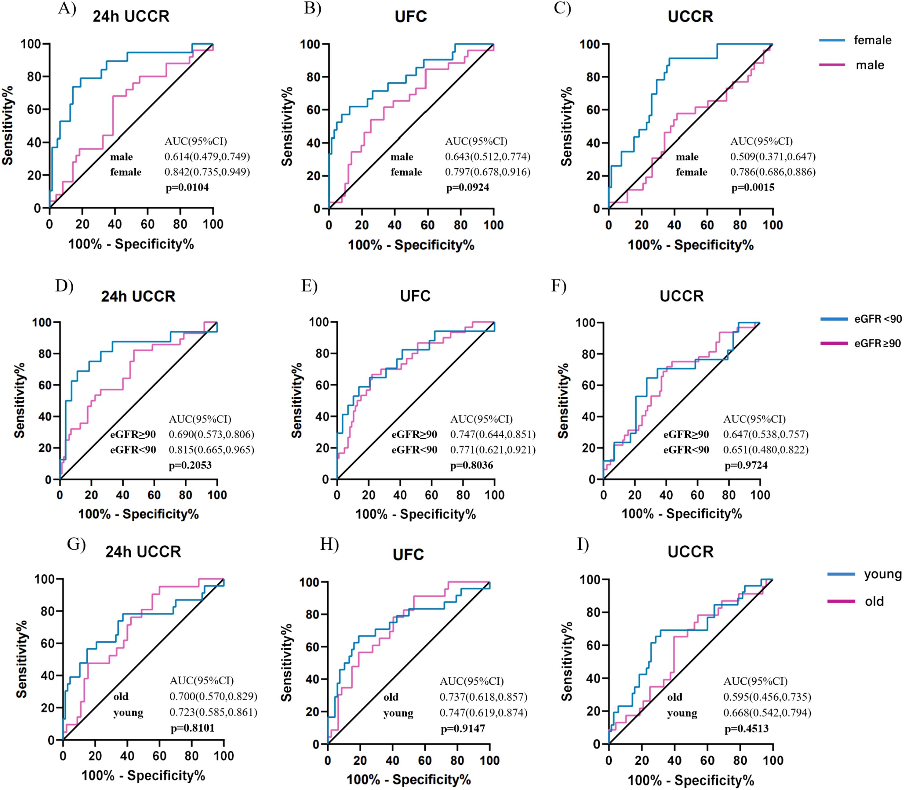 Figure 5. Diagnostic accuracy of urinary cortisol tests across subgroups stratified by sex, age, and renal function for predicting cortisol post DST>1.8 µg/dl. ROC curves for 24-hour UCCR, 24-hour UFC, and morning spot UCCR in predicting cortisol levels post DST >1.8 µg/dL, stratified by sex (A-C), renal function (D-F), and age (G-I). Areas under the curve (AUCs) with exact binomial 95% confidence intervals (95% CI) were calculated for each subgroup, and between-group comparisons were assessed using the Delong test. Solid lines indicate the reference line (AUC = 0.5, no discrimination). DST-dexamethasone suppression test; UCCR-urinary cortisol-to-creatinine ratio; UFC-urinary free cortisol; eGFR-estimated glomerular filtration rate.