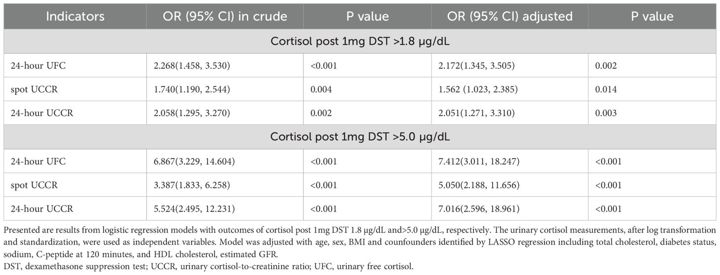 Logistic regression models were used to analyze the association between urinary cortisol tests and 1mg DST results. To identify key variables associated with the 1mg DST results, least absolute shrinkage and selection operator(LASSO) regression was performed. The most relevant variables were selected using a ten-fold cross-validation approach, which determined the optimal penalty term by minimizing prediction error(Supplementary Figure 1). Subsequently, the variables selected by LASSO regression and clinically relevant variables(sex, age and BMI) were used to adjust the logistic regression models.