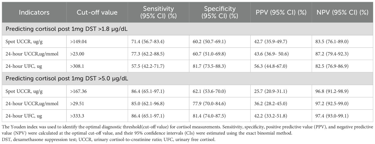 Both morning spot urine samples and 24-hour urine samples were collected. The 24-hour urine sample was collected by discarding the first morning void and subsequently collecting all urine produced over the following 24 hours. Spot urine samples were collected in the morning as the first midstream urine of the day. Creatinine concentrations in 24-hour urine samples were determined using an enzymatic assay, while those in spot urine samples were measured using the creatinine Jaffé method. Urine free cortisol levels were all quantified using a homogeneous enzyme immunoassay (Evermed, China), with calibrators traceable to Standard Reference Material (SRM) 921a from the National Institute of Standards and Technology (NIST), USA. The analytical measurement range was 20.0-1620.0ng/mL (r ≥0.990). According to the manufacturer’s documentation, excessively high concentrations of bilirubin, hemoglobin, or albumin may cause analytical interference or cross-reactivity. The inter-assay and intra-assay coefficients of variation (CV) of the cortisol metabolites measurements are<10.0%. The 24-hour urinary cortisol-to-creatinine ratio(ug/mmol, 24-hour UCCR) and spot urinary cortisol-to-creatinine ratio(ug/g, spot UCCR) were subsequently calculated. Participants also adhered to a standardized protocol for the 1mg overnight DST, with a baseline blood sample collected at 8:00 AM on Day 1. At midnight (0:00 AM) on Day 2, a 1mg oral dose of dexamethasone was administered, followed by the collection of a second blood sample at 8:00 AM to assess serum cortisol level. Serum cortisol concentrations were determined using a chemiluminescent immunoassay (Beckman Coulter, Inc., USA). The analytical measurement range was 0.4-60.0 ug/dL. Potential cross-reactivity may occur with structurally related compounds such as 11-deoxycortisol and other cortisol analogs. The intra-assay coefficient of variation (CV) was <6.7%, and the total imprecision was <7.9%. Both the standard cortisol post-1mg DST cutoff of 138 nmol/L (5.0 µg/dL) and the lower threshold of 50 nmol/L (1.8 µg/dL) were applied. The collection of 24-hour and spot urine samples was performed prior to dexamethasone administration.