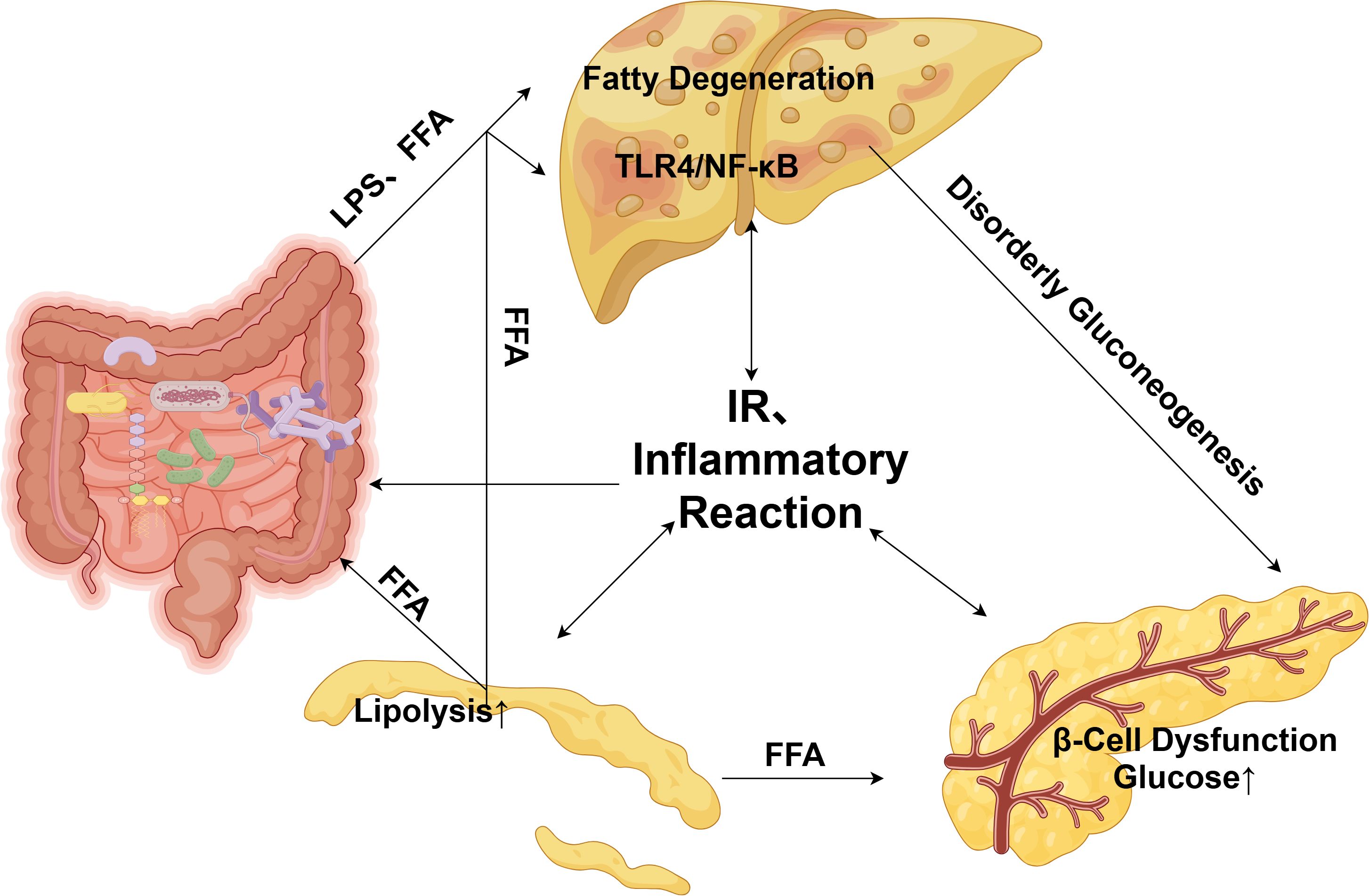 Initiated by dysbiosis, harmful gut-derived products including LPS and FFAs translocate into the liver via the portal circulation. Within the liver, such substances trigger lipid deposition and activate inflammatory pathways like TLR4/NF-κB, leading to hepatic insulin resistance and MASH development. Concurrently, pancreatic β-cells compensate through insulin hypersecretion, causing hyperinsulinaemia. Combined with HIR-driven uncontrolled gluconeogenesis, a state of persistent hyperglycaemia emerges. Chronic glucolipotoxicity then promotes β-cell functional exhaustion and overt T2DM onset (26, 27). The disorder amplifies systemically as insulin-resistant adipose tissue increases lipolysis, flooding the liver with additional FFAs and further exacerbating hepatic steatosis and inflammation. Ultimately, compromised liver and adipose tissues secrete copious inflammatory factors, generating a systemic inflammatory state which intensifies insulin resistance and β-cell dysfunction across all tissues. A self-perpetuating, vicious cycle results, centered on the “gut-liver-pancreas-adipose tissue” axis, interconnected by worsening propelling disease progression (28).