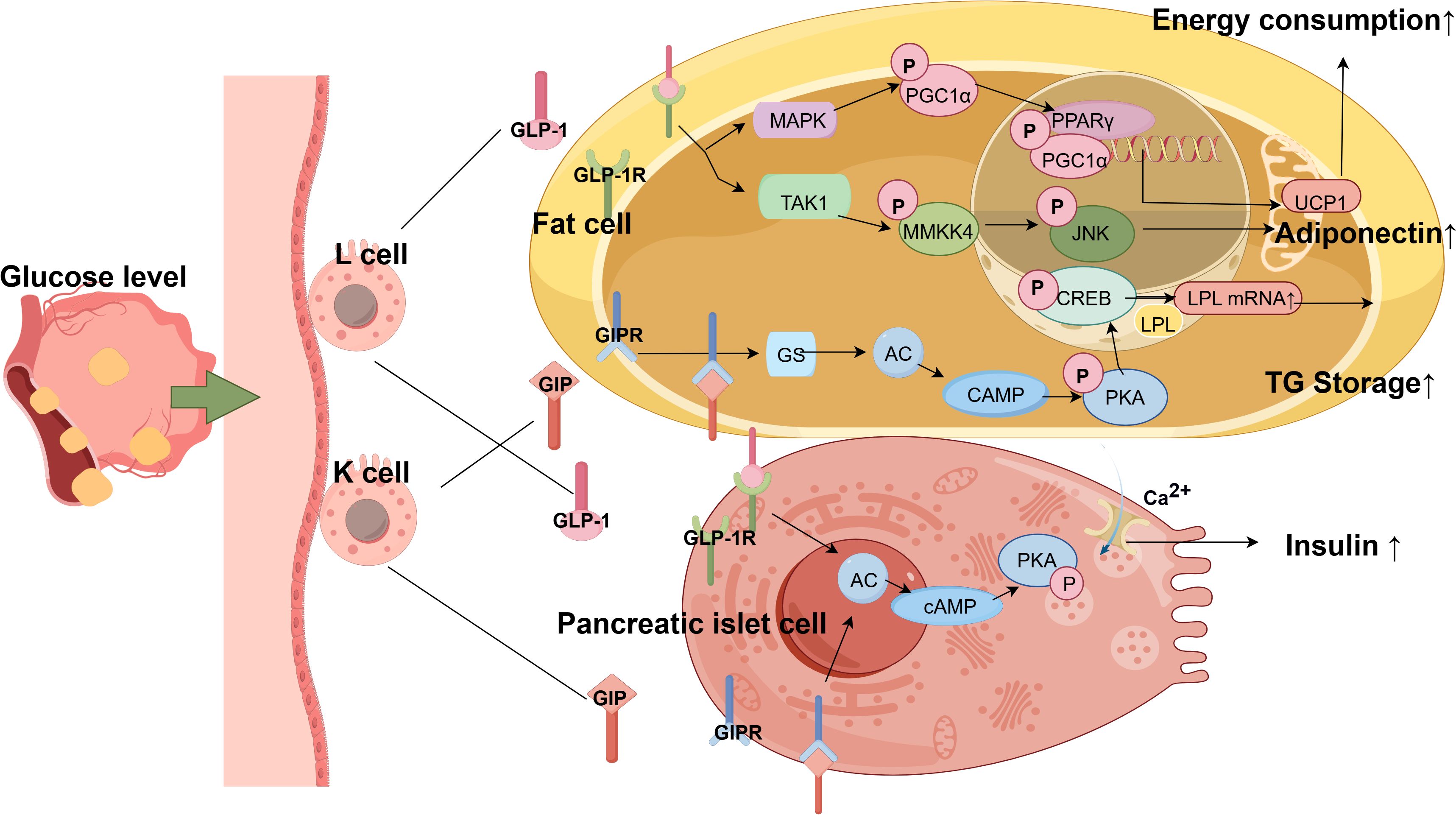 GIP is secreted by K cells in the proximal small intestine, and its release is triggered primarily by glucose and lipids. With respect to the gut–pancreatic islet axis, GIP binds to the GIPR on β cells, activating the cAMP-PKA/EPAC2 signaling pathway and significantly enhancing glucose-stimulated insulin secretion. Furthermore, a study combining in vitro cellular models with human and mice pancreatic islet tissue confirmed that under hypoglycaemic conditions, GIP can act on pancreatic α cells to stimulate glucagon release and, via activation of the ERK/CREB pathway, exert protective and regenerative effects on β cells similar to the effects of GLP-1, collectively maintaining glucose homeostasis (87–89).