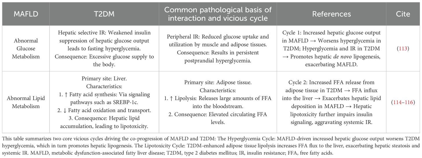As the hepatic manifestation of metabolic disease, MAFLD often co-exists with other metabolism-related extrahepatic conditions. Cross-sectional data revealed a 65.33% global coprevalence of T2DM and MAFLD (9) and 96.82% of T2DM patients have metabolic dysfunction-associated steatohepatitis (MASH) (10). The co-morbidity of MAFLD and T2DM is believed to stem from disturbances in glucose and lipid metabolism. Furthermore (11), these two conditions may influence each other’s progression through direct or indirect pathways, ultimately forming the “triangular association” illustrated in Table 1.