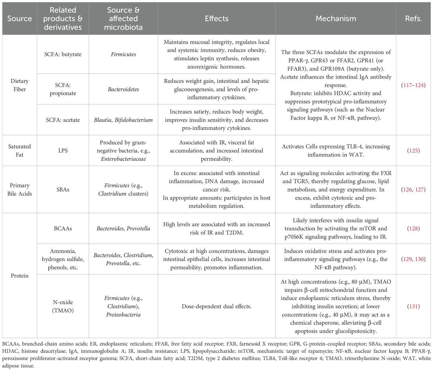 Daniel (15) proposed the hypothesis that disruption of the intestinal barrier and its associated dysbiosis could lead to IR and hepatic steatosis and accelerate the progression of metabolic syndrome, a view subsequently validated by further research. Metabolomic studies of body fluids (16) have revealed that distinct categories of metabolites are altered in metabolic disorders associated with gut microbiota dysbiosis. This dysbiosis is not a generalized change but manifests as a systematic imbalance of specific bacterial taxa with crucial metabolic functions, directly regulating the levels and activity of messenger molecules.