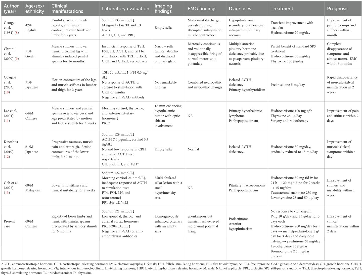 In the three cases that initially applied standard SPS treatment, including sedatives and anti-spasticity drugs, only transient or partial improvement if any response was observed. Subsequent treatment strategies primarily focused on hormone replacement therapy. Hydrocortisone was initiated, either orally or intravenously, at daily doses ranging from 10 to 300 mg in most patients (n = 6). Moreover, prednisolone 5 mg daily was prescribed alternatively in one case as well. In acute adrenal crisis, high-dose intravenous methylprednisolone and immunoglobulin were administered in combination. Concomitant hypothyroidism and hypogonadism were managed with thyroxine (n = 4) and testosterone (n = 1) replacements, respectively, and surgery or radiotherapy was applied in two patients with pituitary tumors. All the treatment received favorable outcomes, with rapid improvements of neuromuscular symptoms within days or weeks.