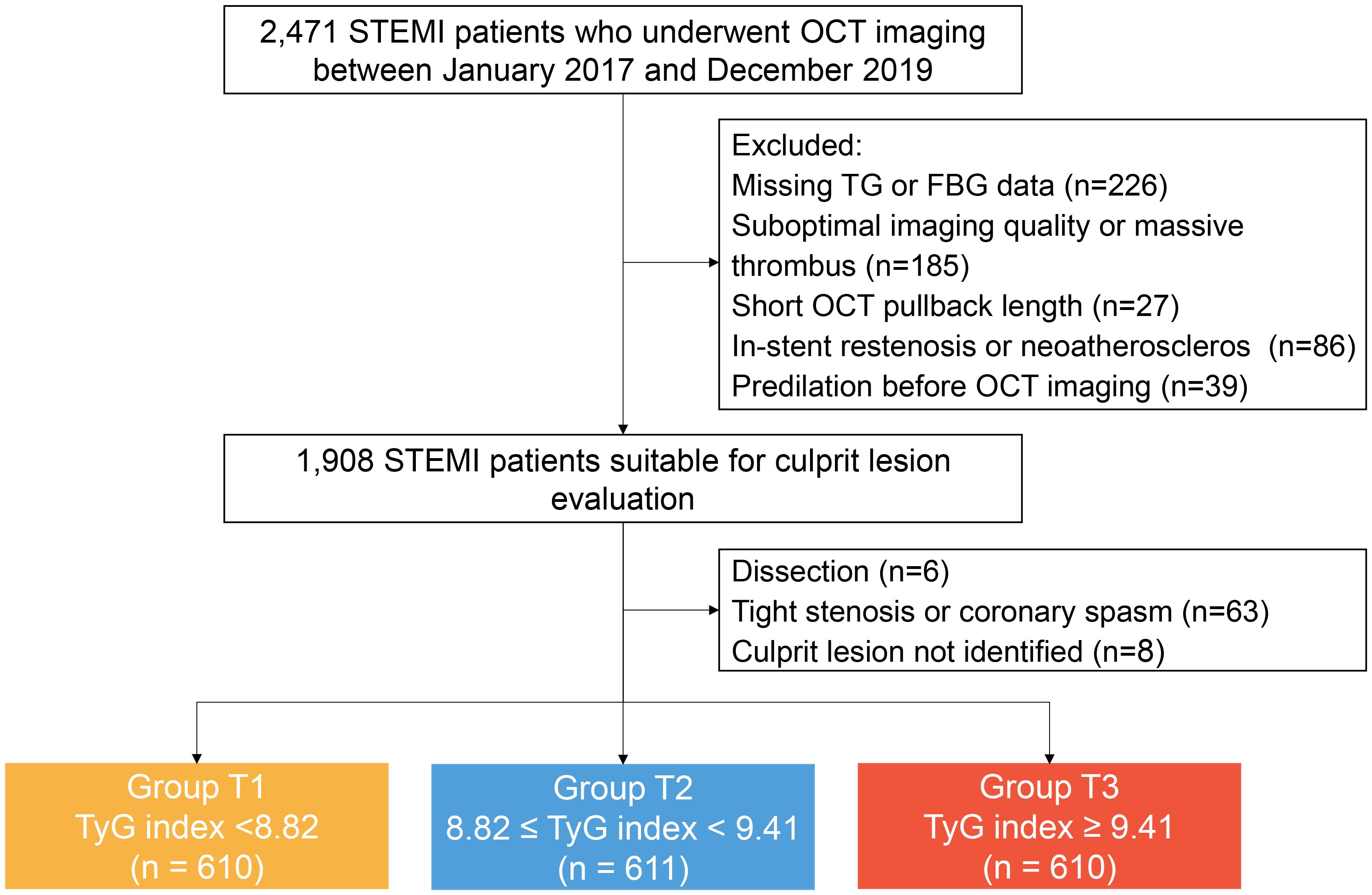 Figure 1. Study flow chart. FBG, fasting blood-glucose; OCT, optical coherence tomography; STEMI, ST-segment elevation myocardial infarction; TyG, triglyceride glucose; TG, triglyceride.