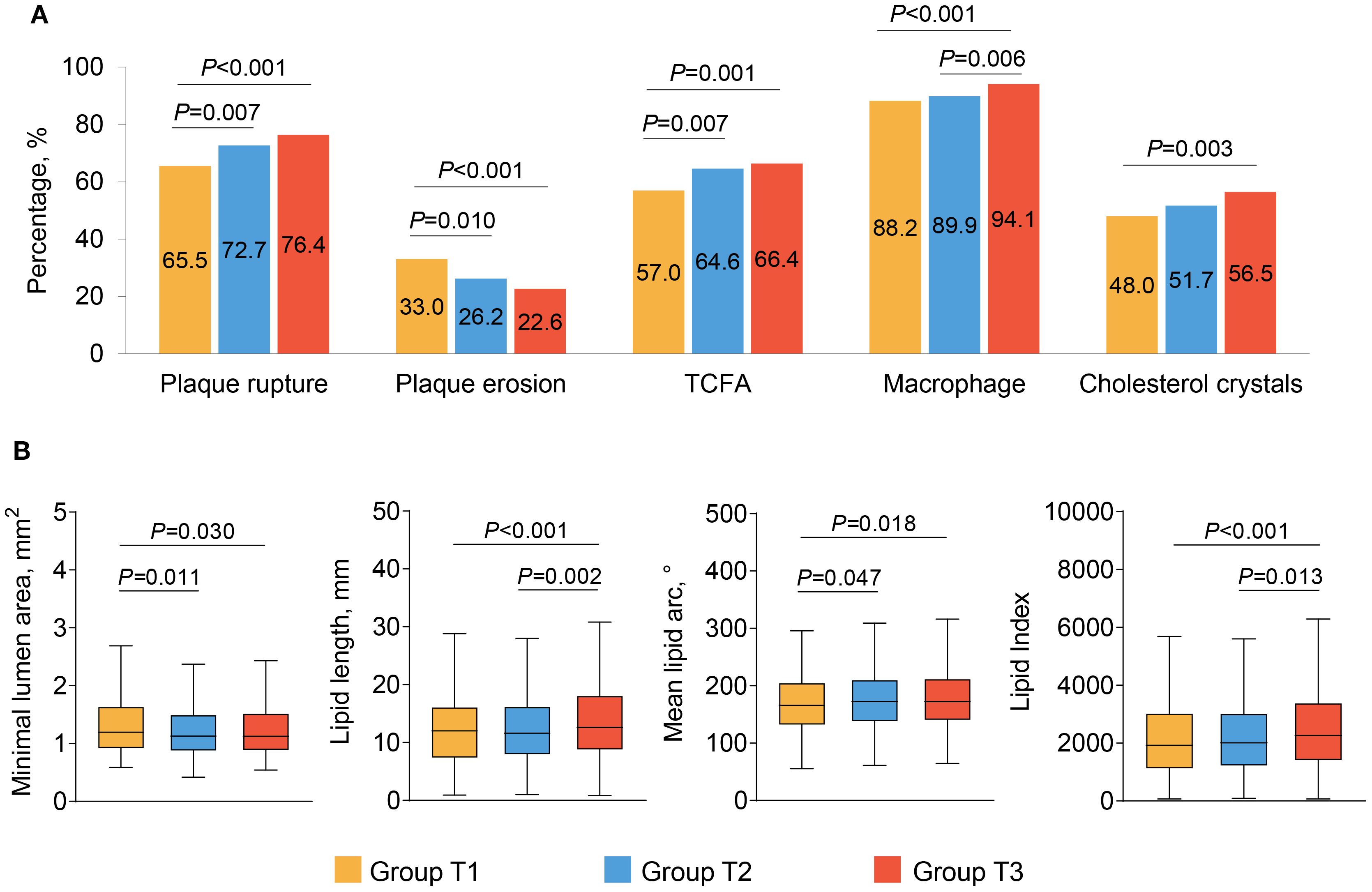 Bar and box plots compare three groups, T1, T2, and T3, in cardiovascular health metrics. Bar plot (A) shows percentages of plaque rupture, plaque erosion, TCFA, macrophage, and cholesterol crystals with significant p-values. Box plots (B) display minimal lumen area, lipid length, mean lipid arc, and lipid index, also showing significant p-values. Group T1 is yellow, T2 is blue, and T3 is red.