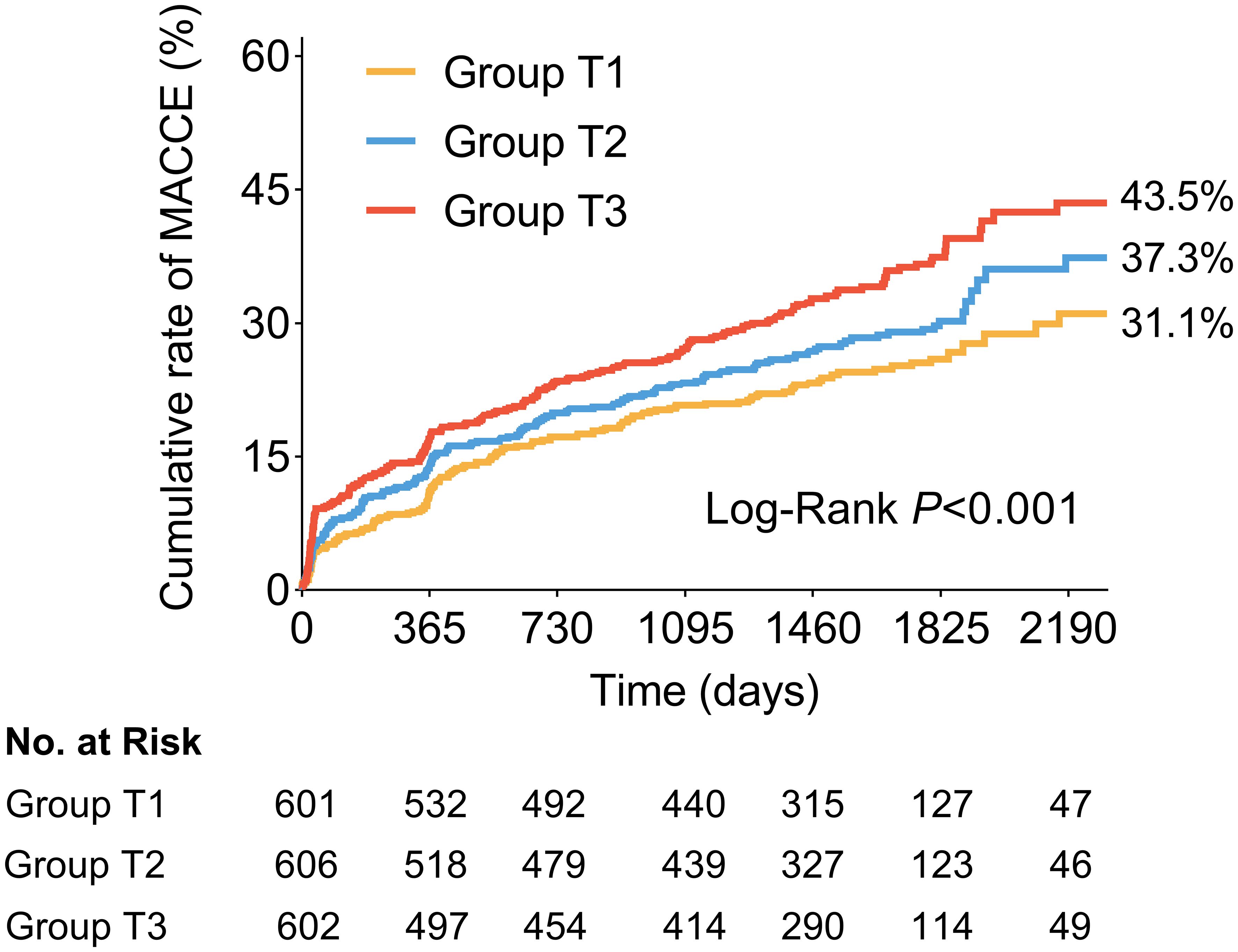 Line graph showing the cumulative rate of major adverse cardiac and cerebrovascular events (MACCE) over 2190 days for three groups: T1 (yellow), T2 (blue), and T3 (red). Group T3 has the highest rate at 43.5%, followed by T2 at 37.3%, and T1 at 31.1%. The log-rank P-value is less than 0.001. A table below shows the number of individuals at risk over time for each group.