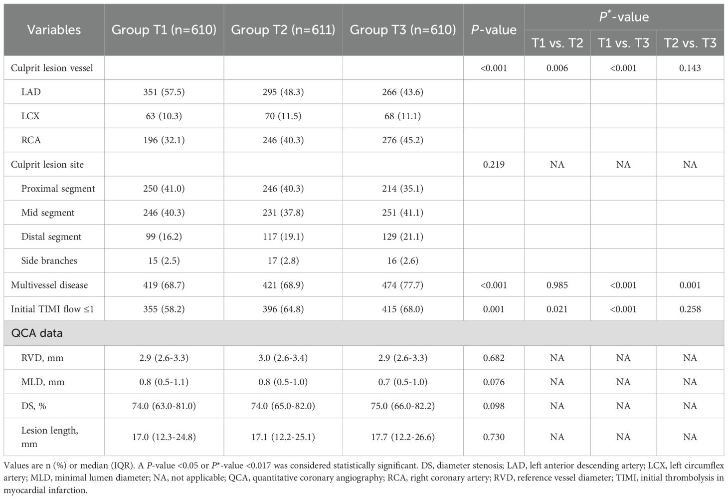 The lesion distribution and QCA data are listed in Table 2. The majority of analyzed culprit lesions were located in the left anterior descending artery, 57.5% in Group T1, 48.3% in Group T2, and 43.6% in Group T3 (P<0.001). Patients in Group T3 presented more frequently with initial TIMI flow grade ≤1 (68.0% vs. 58.2%, P = 0.001) and multivessel disease (77.7% vs. 68.7%, P<0.001), compared with those in Group T1. No significant inter-group differences were observed in the QCA findings of culprit lesions (all P>0.05).