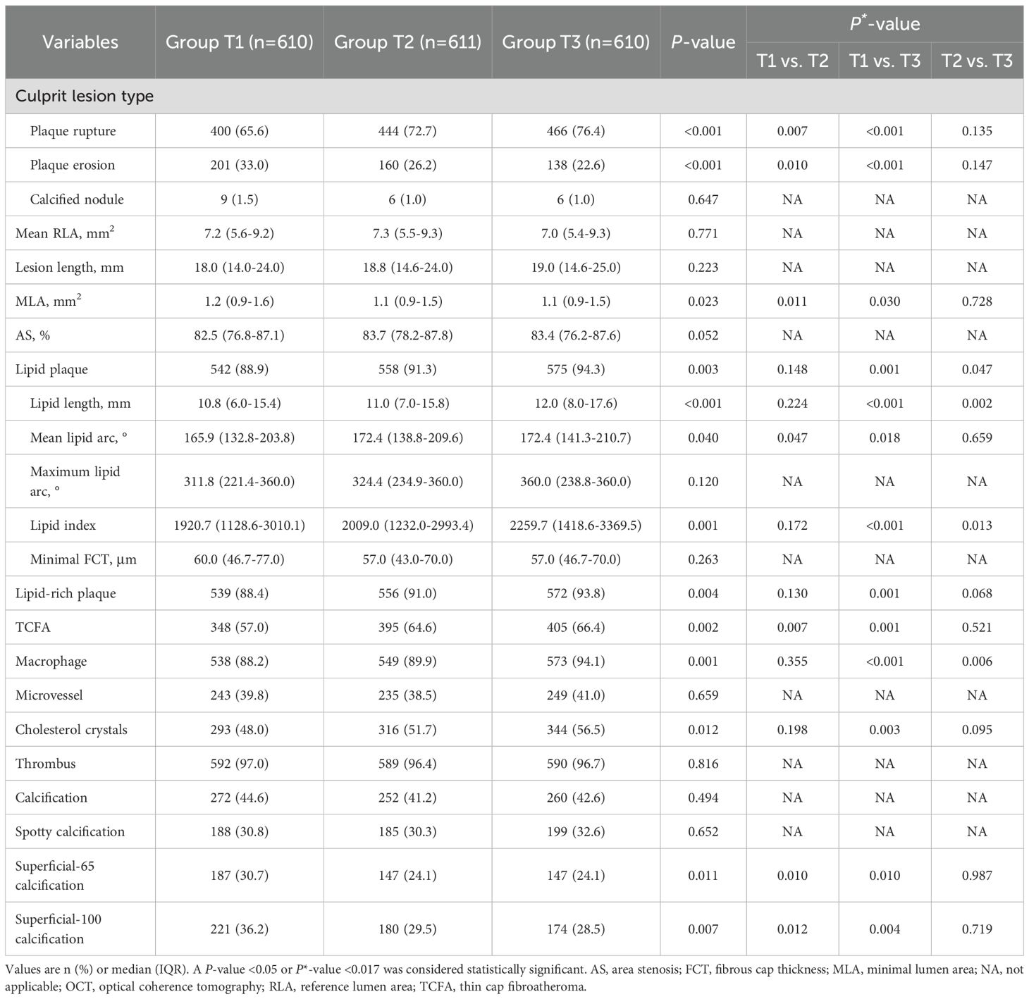 Comparisons of OCT findings among the three groups are shown in Figure 2 and Table 3. Patients in Group T3 and Group T2 exhibited a higher prevalence of plaque rupture (76.4% vs. 72.7% vs. 65.6%, P<0.001) and TCFA (66.4% vs. 64.6% vs. 57.0%, P = 0.002), and a lower prevalence of plaque erosion (22.6% vs. 26.2% vs. 33.0%, P<0.001) than patients in Group T1. A more frequent incidence of lipid-rich plaque, macrophage, and cholesterol crystals was also observed in patients with the highest TyG index, compared with those with the lowest TyG index (all P<0.05). Patients with the highest TyG index had longer lipid length, greater lipid index, and smaller minimal lumen area (P<0.05).