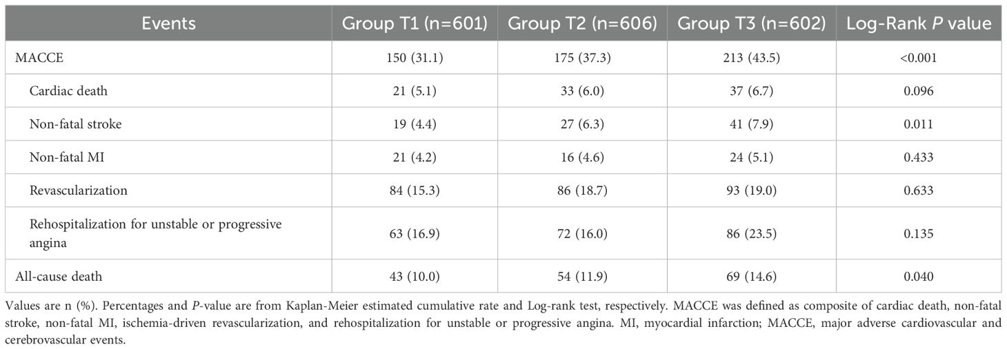The clinical follow-up data were available in 98.8% (1809/1831) of patients. During a median follow-up of 4.2 years (IQR: 4.0-5.0 years), 538 patients (29.7%) experienced MACCE after discharge, including 91 (5.0%) cardiac death, 87 (4.8%) non-fatal stroke, 61 (3.4%) non-fatal MI, 263 (14.5%) ischemia-driven revascularization, and 221 (12.2%) rehospitalization (Table 5). As shown in Figure 3, the cumulative incidence of MACCE increased with increasing tertiles of the TyG index, with the highest incidence in Group T3 (31.1% vs. 37.3% vs. 43.5%, Log-rank P<0.001). There were no significant differences in discharge medication among the three groups (Supplementary Table S5).
