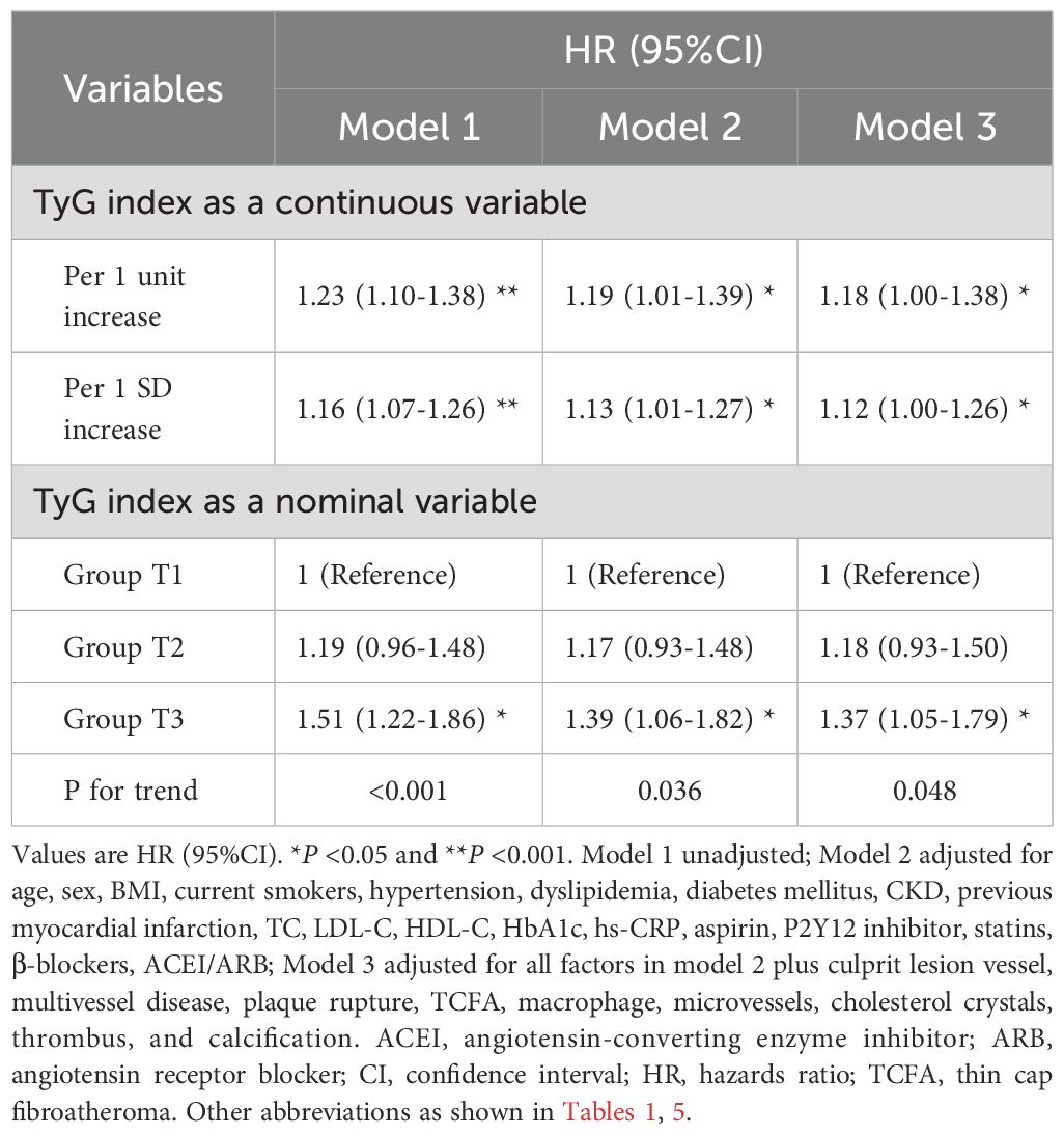 Sensitivity analysis was performed to assess the robustness of our findings after excluding patients who had received prior lipid- or glucose-lowering therapy (Supplementary Tables S7-10). The TyG index remained an independent predictor of plaque rupture and MACCE, even after adjustment for HbA1c, hs-CRP, and lipid profiles.