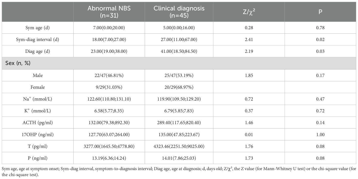 Among 115 patients, 33 (SW = 31, SV = 2) patients accepted NBS were reported abnormal 17OHP. Comparative analysis of SW patients diagnosed via abnormal NBS (n=31) versus clinical diagnosis (n=45) revealed key differences (Table 2). NBS significantly reduced the diagnostic delay by 50% (median: 18d vs. 27d; P = 0.02). Accordingly, the age at diagnosis was substantially earlier in the NBS group (median: 21d vs. 43d; P = 0.03). However, no significant differences were observed between the two groups in sex distribution, electrolyte levels, or steroid hormone concentrations at the time of diagnosis.