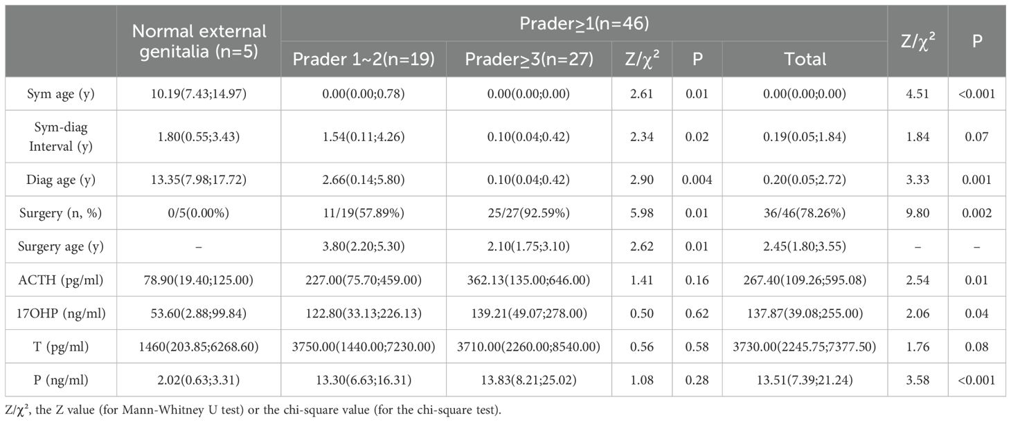 As summarized in Table 3, clinical and hormonal correlates also differed significantly according to Prader classification. Specifically, subjects with Prader ≥1 (n = 46) exhibited significantly earlier symptom onset and time of diagnosis (P < 0.001), along with higher ACTH, 17OHP, and progesterone levels (P < 0.05), compared to those with normal external genitalia (n = 5). Additionally, the surgery rate was markedly higher in the Prader ≥1 group (78.26% vs. 0.00%, P = 0.002). When comparing the Prader ≥3 (n = 27) and Prader 1~2 (n = 19) subgroups, the former was associated with a younger age at diagnosis and surgery (P < 0.01), a shorter diagnostic delay (P = 0.02), and a higher surgical rate (92.59% vs. 57.89%, P = 0.01).