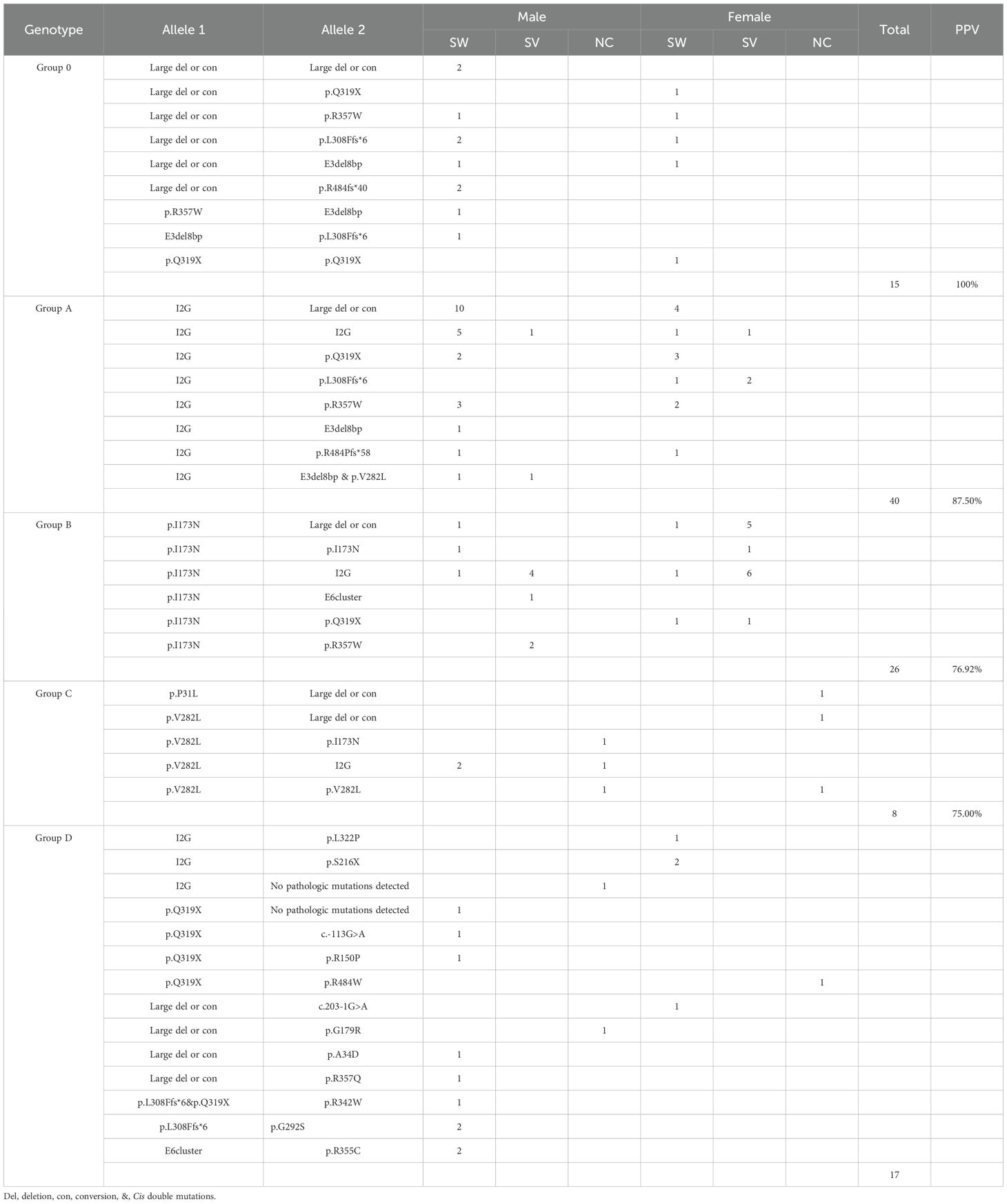 Genotype-phenotype correlations were summarized in Table 4. PPV for each variant group was calculated as follows: Group 0 (null variants) exhibited a 100% PPV for the SW form, while Group A showed an 87.5% PPV for SW. Conversely, Group B demonstrated a 76.9% PPV for the SV form, and Group C had a 75.0% PPV for the NC form.