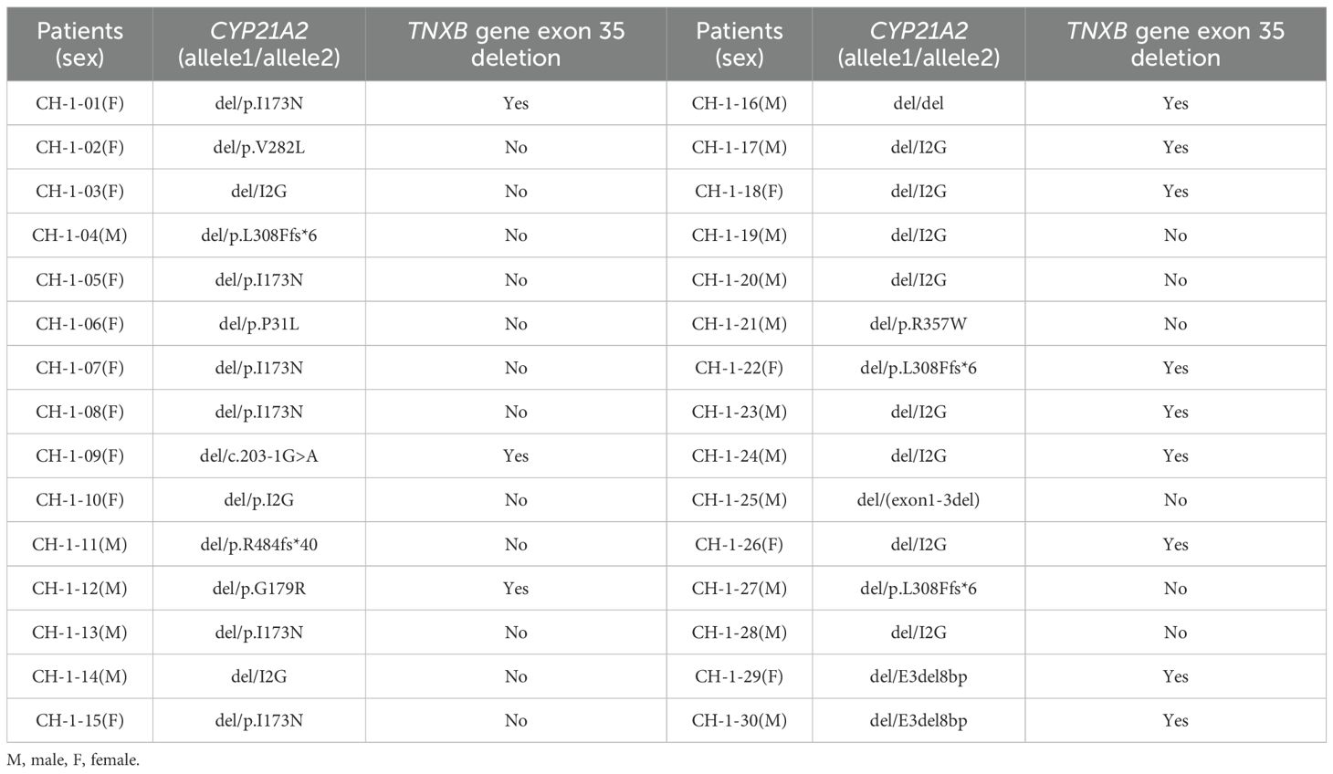 Of the 30 patients harboring CYP21A2 deletions, 40% (12/30) exhibited co-occurring TNXB exon 35 deletions, confirming a diagnosis of CAH-X CH-1 (Table 5; Supplementary Figure S5).