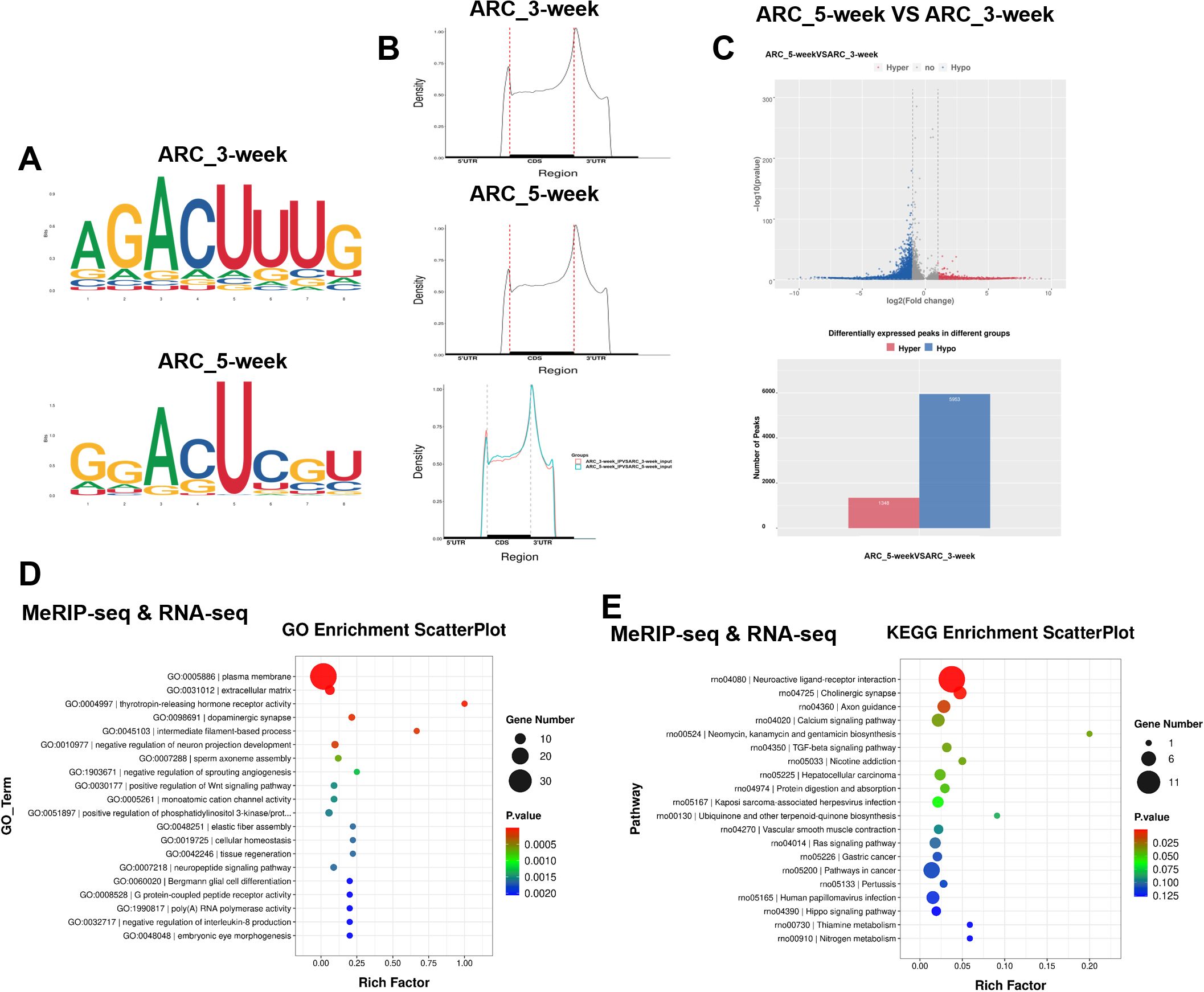 Figure 1. MeRIP-seq and RNA-seq of the hypothalamic ARC of 3-week-old and 5-week-old female rats. (A) Top enriched motifs for m6A peaks identified in the ARCs of female rats at 3 and 5 weeks of age. (B) Distribution of m6A sites plotted by mRNA transcript. (C) Volcano plot showing the m6A enrichment of genes in the ARCs of female rats at 3 and 5 weeks of age. (D) Gene Ontology (GO) enrichment analysis of differentially expressed genes (DEGs) in the ARCs of female rats at 3 and 5 weeks of age based on combined MeRIP-seq and RNA-seq data. (E) Kyoto Encyclopedia of Genes and Genomes (KEGG) pathway analysis of DEGs in the ARCs of female rats at 3 weeks and 5 weeks of age based on combined MeRIP-seq and RNA-seq data. ARC, arcuate nucleus (ARC_3-week, ARC_5-week; n = 1). Pathway analysis was performed using the KEGG database (www.kegg.jp/kegg/kegg1.html).