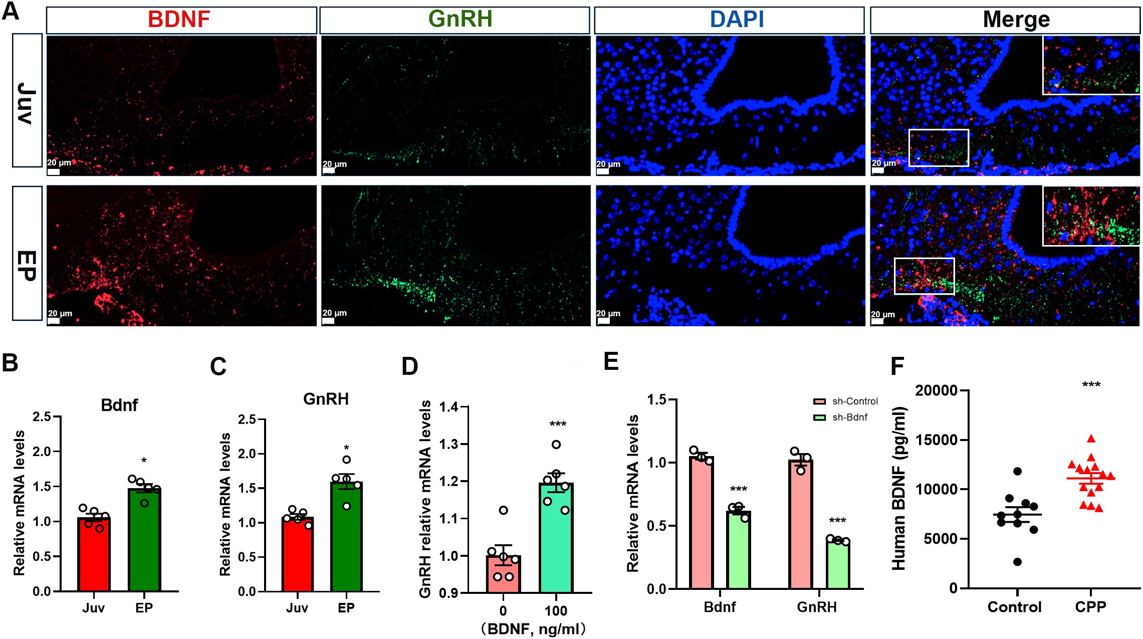 Figure 2. BDNF expression is positively correlated with GnRH expression during puberty. (A) Double immunofluorescence (IF) staining showed that the BDNF protein (red) was colocalized with the GnRH (green) protein and cell nuclei (DAPI, blue) in the arcuate nucleus (ARC) (n=3; scale bar: 20 μm, 50 μm). (B) qRT–PCR revealed that Bdnf mRNA expression in the hypothalamus increased gradually with time following puberty onset (n=5). Juv, juvenile, 3 weeks old; EP, early puberty, 5 weeks old. (C) qRT–PCR revealed that GnRH mRNA expression in the hypothalamus increased gradually with time following puberty onset (n=5). Juv, juvenile, 3 weeks old; EP, early puberty, 5 weeks old. (D) qRT–PCR revealed that GnRH expression was increased in GT1–7 cells stimulated with 100 ng/ml recombinant BDNF protein (n=6). (E) qRT–PCR showed that the GnRH mRNA level decreased when Bdnf expression was downregulated (n=3). (F) BDNF levels in the peripheral serum of girls with central precocious puberty (CPP) were higher than those in girls in the control group (control, n=10; CPP, n=14). The results are shown as the means ± S.E.M.s. *P < 0.05 and ***P < 0.001. Two-tailed Student’s t test was used.