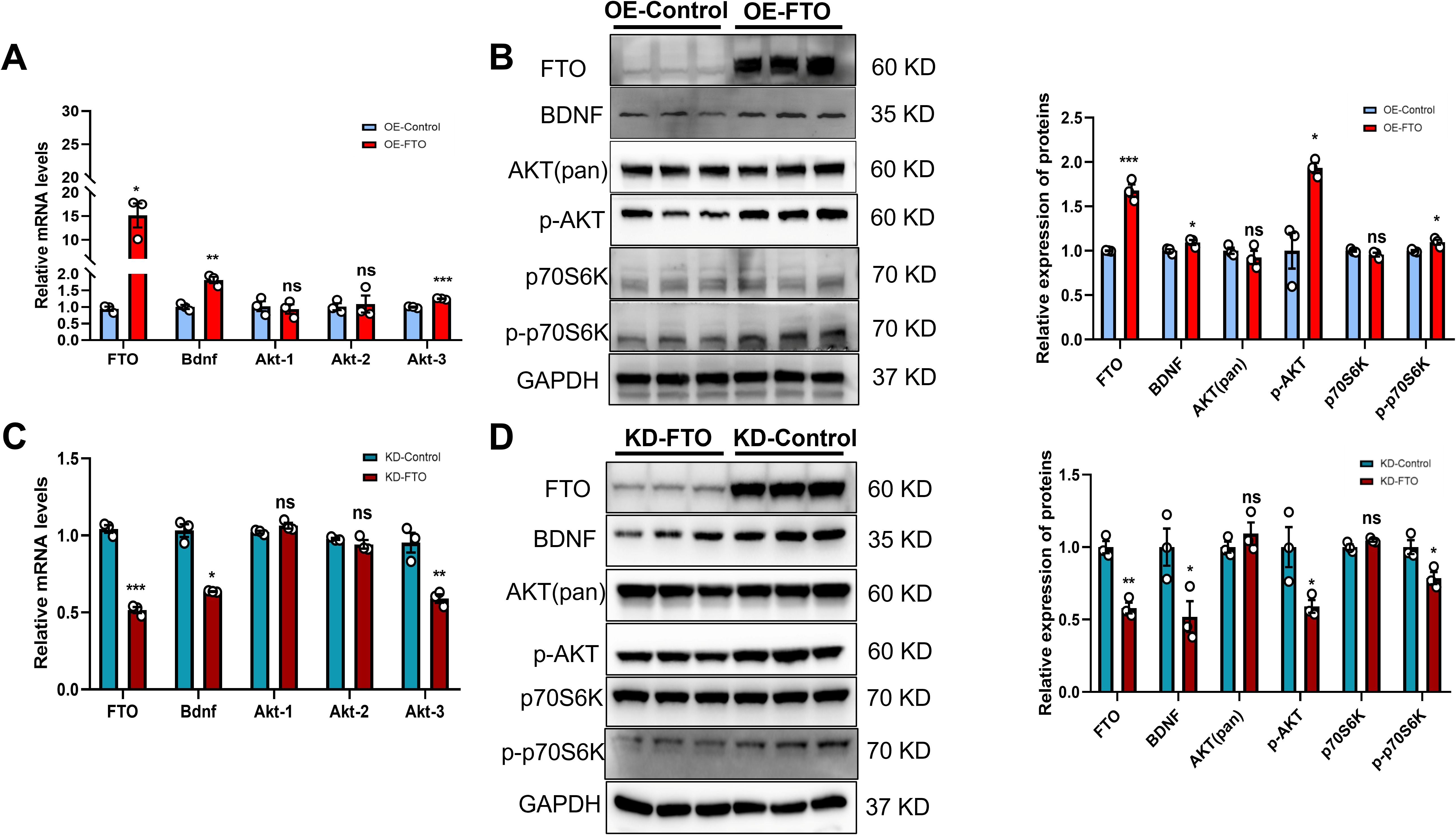 Figure 3. FTO positively regulates BDNF expression by activating PI3K/Akt signaling. (A, C) FTO, Bdnf, Akt-1, Akt-2 and Akt-3 mRNA levels in GT1–7 cells overexpressing FTO (OE-FTO) (A) or with knockdown of FTO (KD-FTO) (C) were determined via qRT–PCR. FTO positively regulated the expression of Bdnf (n=3). β-actin mRNA was used as an internal control. (B) Western blot showing that BDNF/PI3K/Akt signaling was activated following FTO overexpression (n=3). The protein levels of FTO, BDNF, p-AKT, and p-p70S6K were significantly increased, while total Akt and p70S6K levels did not change. (D) The expression of proteins in the BDNF/PI3K/Akt signaling pathway was reduced when FTO expression was downregulated (n=3). The protein levels of FTO, BDNF, p-AKT, and p-p70S6K were significantly decreased, while the total Akt and p70S6K levels did not change. GAPDH was used as a loading control. The bars represent the means ± S.E.M.s. *P < 0.05, **P < 0.01, ***P < 0.001, and ns, P > 0.05 compared with the control group. Two-tailed Student’s t test was used.