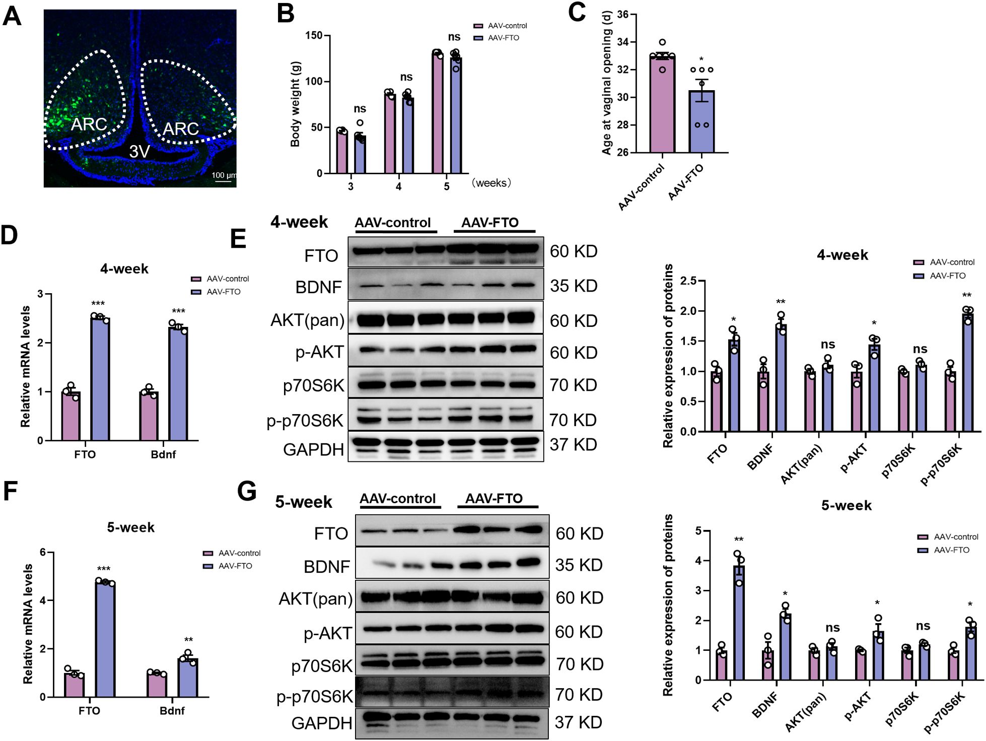Figure 5. FTO overexpression in the ARC activates BDNF signaling in female rats, accelerating puberty onset. (A) Transduction of ARC cells with scAAV in female rats. Green, scAAV-infected cells; blue, DAPI-stained cell nuclei in the hypothalamus; dotted line, ARC; 3V, third ventricle. Scale bars, 100 μm. (B) The body weights of female rats at three different developmental stages did not differ between the two groups (n=6). (C) Vaginal opening was significantly accelerated in the AAV-FTO group relative to the AAV-control group (n=6). (D, F) The mRNA levels of FTO and Bdnf in the hypothalamus were determined using qRT–PCR at 4 weeks (D) and 5 weeks (F) of age (n=3). β-Actin was used as the internal reference. (E) Quantification of the data indicated that the protein levels of FTO, BDNF, p-AKT, and p-p70S6K were significantly increased in the AAV-FTO group compared with the control group, whereas total Akt and p70S6K levels did not change in 4-week-old female rats (n=3). (G) Western blot analysis indicated that the protein levels of FTO, BDNF, p-AKT, and p-p70S6K were significantly increased in the AAV-FTO groups compared with the control group, whereas total Akt and p70S6K levels did not change in 5-week-old female rats (n=3). AAV-FTO was injected into the FTO-overexpressing group, and AAV-control was injected into the AAV negative control group. ARC, arcuate nucleus; Three V, third ventricle. The results are shown as the means ± S.E.M.s. *P < 0.05, **P < 0.01, ***P < 0.001, and ns, P > 0.05. Two-tailed Student’s t test was used.