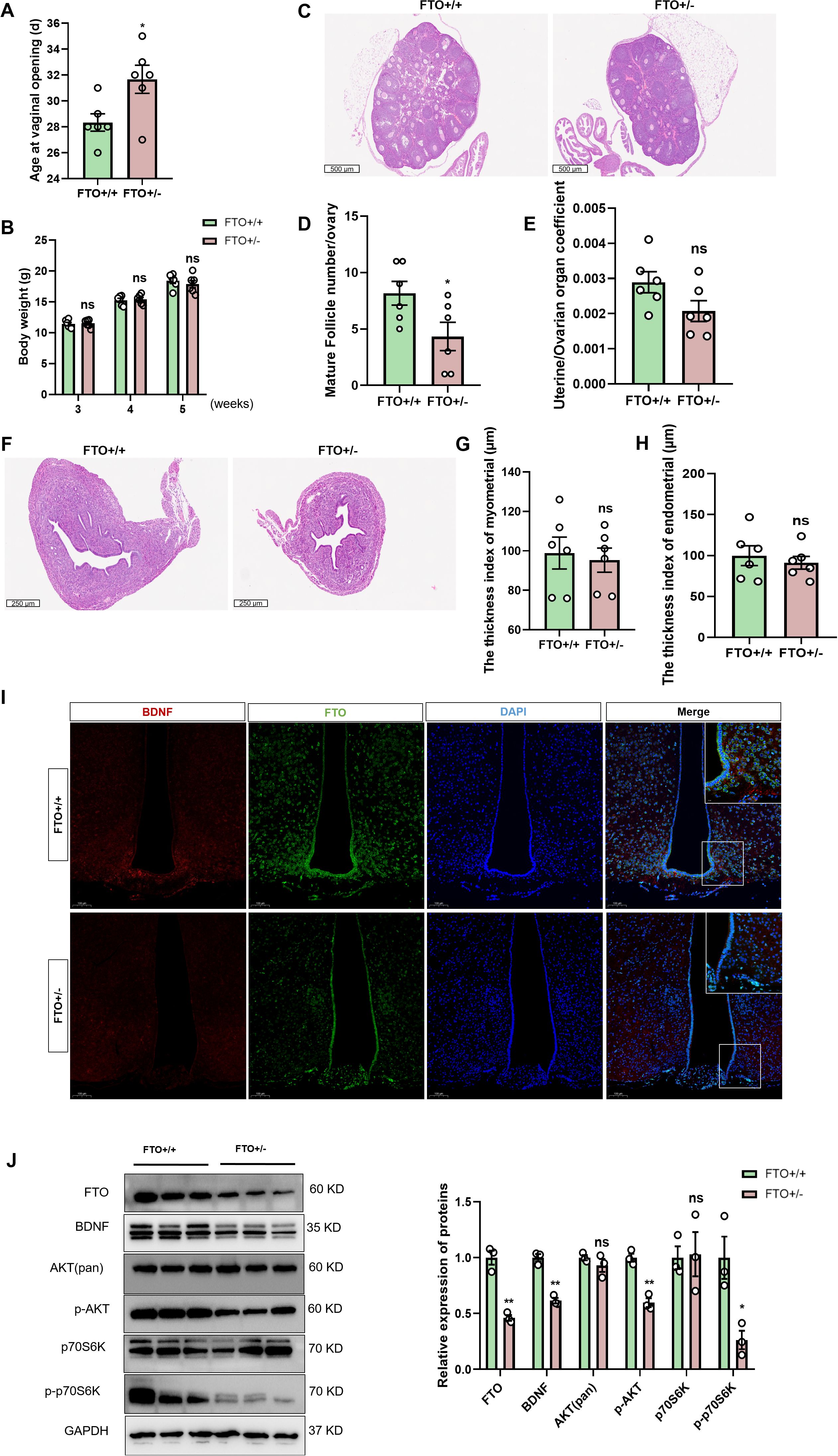 Figure 6. Loss of FTO expression leads to a delay in puberty and inhibition of the BDNF/PI3K/Akt pathway. (A) The onset of vaginal opening was significantly delayed in the FTO+/- group compared with that in the FTO+/+ group (n=6). (B) The body weights of female mice at different developmental stages did not differ between the two groups (n=6). (C) H&E staining was performed to evaluate ovarian size and follicle morphology in FTO-deficient female mice at 4 weeks (n=6; scale bar=500 μm). (D) Numbers of mature follicles in the ovaries of FTO+/+ and FTO+/- female mice (n=6). (E) The uterine/ovarian organ coefficients of FTO-deficient mice tended to decrease at 4 weeks (n=6). (F–H) Pathological assessment of the uterus in FTO-deficient female mice at 4 weeks of age by H&E staining (F); the differences in the endometrial thickness (G) and myometrial thickness (H) between the groups were not significant (n=6). (I) Immunofluorescence (IF) staining for BDNF (red) and FTO (green) and nuclear staining (DAPI, blue) were significantly reduced when FTO expression was lost (n=3; scale bar=50 μm, 20 μm). (J) The protein levels of FTO, BDNF, p-AKT, p-p70S6K, total Akt and p70S6K in the hypothalamus of 4-week-old female mice were measured by Western blotting (n=3). The results are shown as the means ± S.E.M.s. *P < 0.05, **P < 0.01, and ns, P > 0.05. Two-tailed Student’s t test was used.