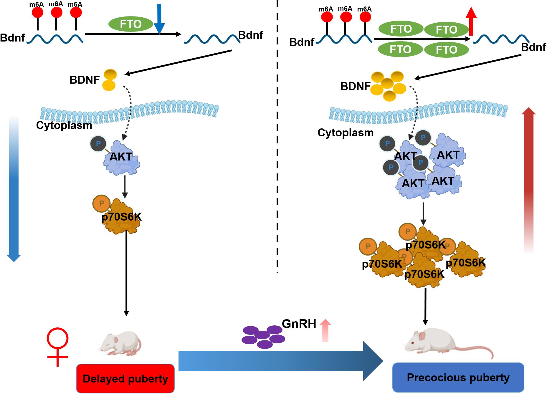 In summary, our research highlights the critical role of BDNF in regulating puberty onset. Our methodology integrated m6A profiling and gene expression analysis, which facilitated the identification of key mRNAs modified by FTO. Among the transcripts identified, those exhibiting alterations in m6A methylation were found to be significantly involved in the BDNF pathway. Notably, these changes—particularly in genes associated with the BDNF pathway—may accelerate puberty onset associated with FTO overexpression. The FTO-mediated m6A methylation of BDNF regulates the PI3K/Akt pathway in the hypothalamus, thereby influencing puberty onset.