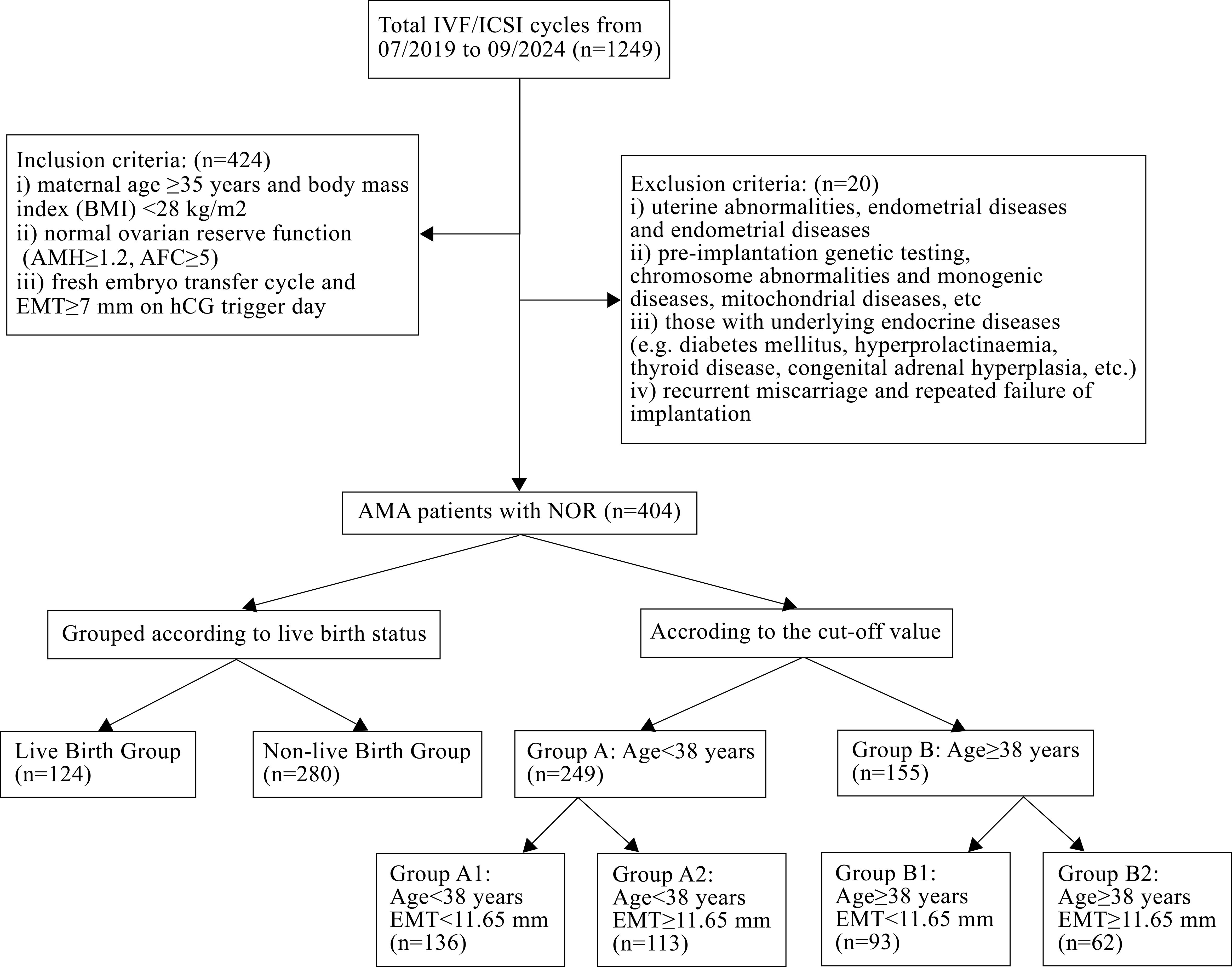 AMA, Advanced maternal age; NOR, Normal ovarian reserve; IVF, In vitro fertilization; ICSI, Intracytoplasmic sperm injection; ROC, Receiver operating characteristic; EMT, Endometrial thickness; AMH, Anti-Müllerian hormone; AFC, Antral follicle count; DOR, Diminished ovarian reserve; ART, Assisted reproductive technology; CDR, Cumulative delivery rates; CLBR, Cumulative live birth rate; BMI, Body mass index; PGT, Preimplantation genetic testing; GDM, Gestational diabetes mellitus; RPL, Recurrent pregnancy loss; FSH, Follicle-stimulating hormone; LH, Luteinizing hormone; E2, Estrogen; Gn, Gonadotropin; HCG, Human chorionic gonadotropin; r-hCG, Recombinant human chorionic gonadotropin; OHSS, Ovarian hyperstimulation syndrome; LSD, Least significance difference; COS, Controlled ovarian stimulation; 2PN, Two pronuclei; AUC, Area under the curve; PGT-A, Preimplantation genetic testing for aneuploidy.