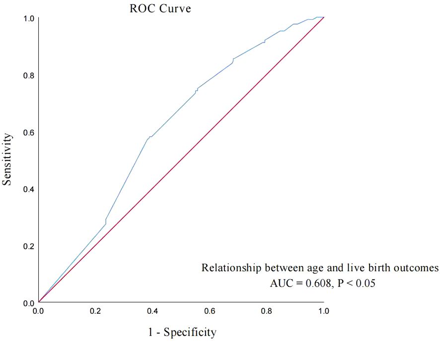 To further explore the relationship between age and live birth of POSEIDON group 2 patients, an ROC curve was used and the results are shown in Figure 2. The area under the curve (AUC) of the age for predicting the live birth was 0.608 (95% CI: 0.558–0.658, p < 0.001). According to the Youden index, the cutoff value of the ROC curve is 37.915, and age has the highest sensitivity and specificity (75.0% and 44.3%, respectively) in predicting live birth. According to the cutoff value, patients were divided into group A (age < 38 years, n = 249) and group B (age ≥ 38 years, n = 155).