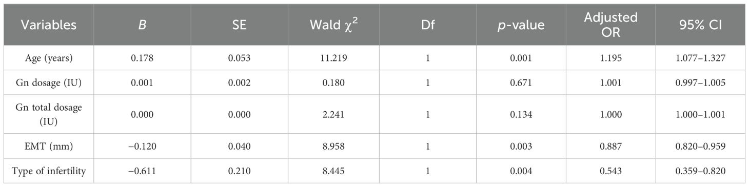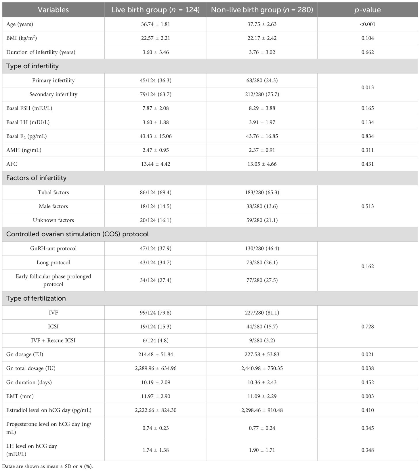 According to clinical outcomes, patients were divided into 2 groups: the live birth group (n = 124) and the non-live birth group (n = 280). The comparison of baseline characteristics between the two groups is shown in Table 1. The results indicated that compared to the non-live birth group, age, Gn dosage, and Gn total dosage in the live birth group were significantly lower (p < 0.05), while the EMT on transfer day was significantly higher (p < 0.05). The type of infertility showed statistically significant differences (p = 0.013). There was no significant difference in other characteristics between the two groups.