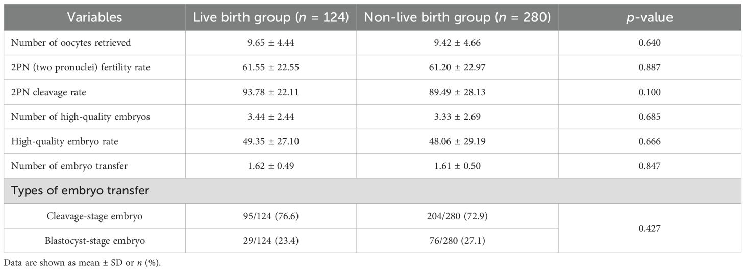 Table 1. The comparison of baseline characteristics and ovulation induction between the live birth group and the non-live birth group.