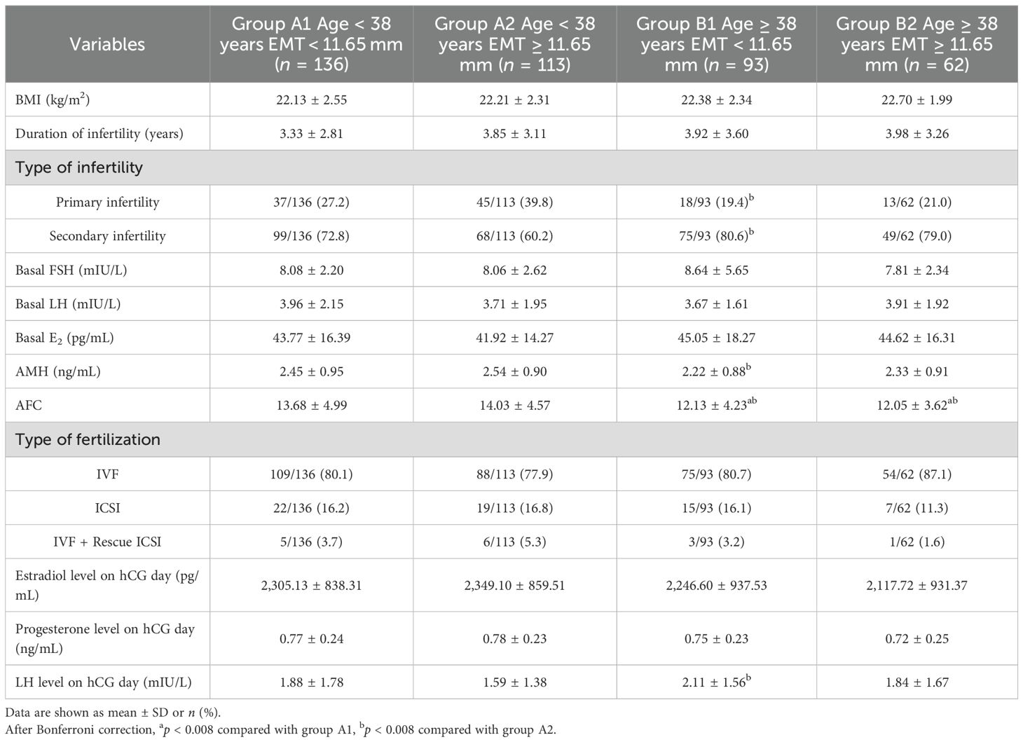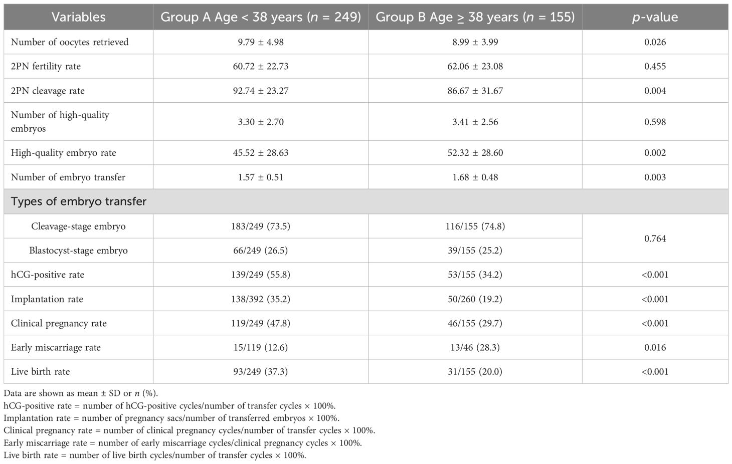 Table 4. The comparison of baseline characteristics and ovulation induction between group A and group B.