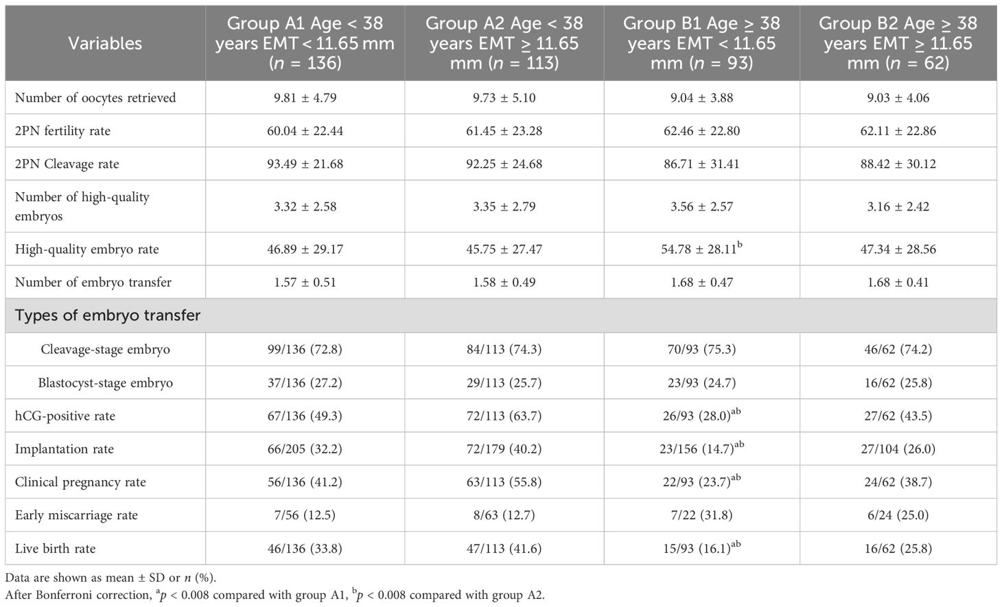 The comparison of laboratory parameters and clinical outcomes between 4 groups is shown in Table 7. The results indicated that the high-quality embryo rate in group B1 was significantly higher than that in group A2 (p = 0.002). The hCG-positive rate (p = 0.001; p < 0.001), embryo implantation rate (p < 0.001; p < 0.001), clinical pregnancy rate (p = 0.006; p < 0.001), and live birth rate (p = 0.003; p < 0.001) were significantly lower than those in group A1 and group A2. There was no significant difference in early miscarriage rate and other characteristics between the subgroups either.