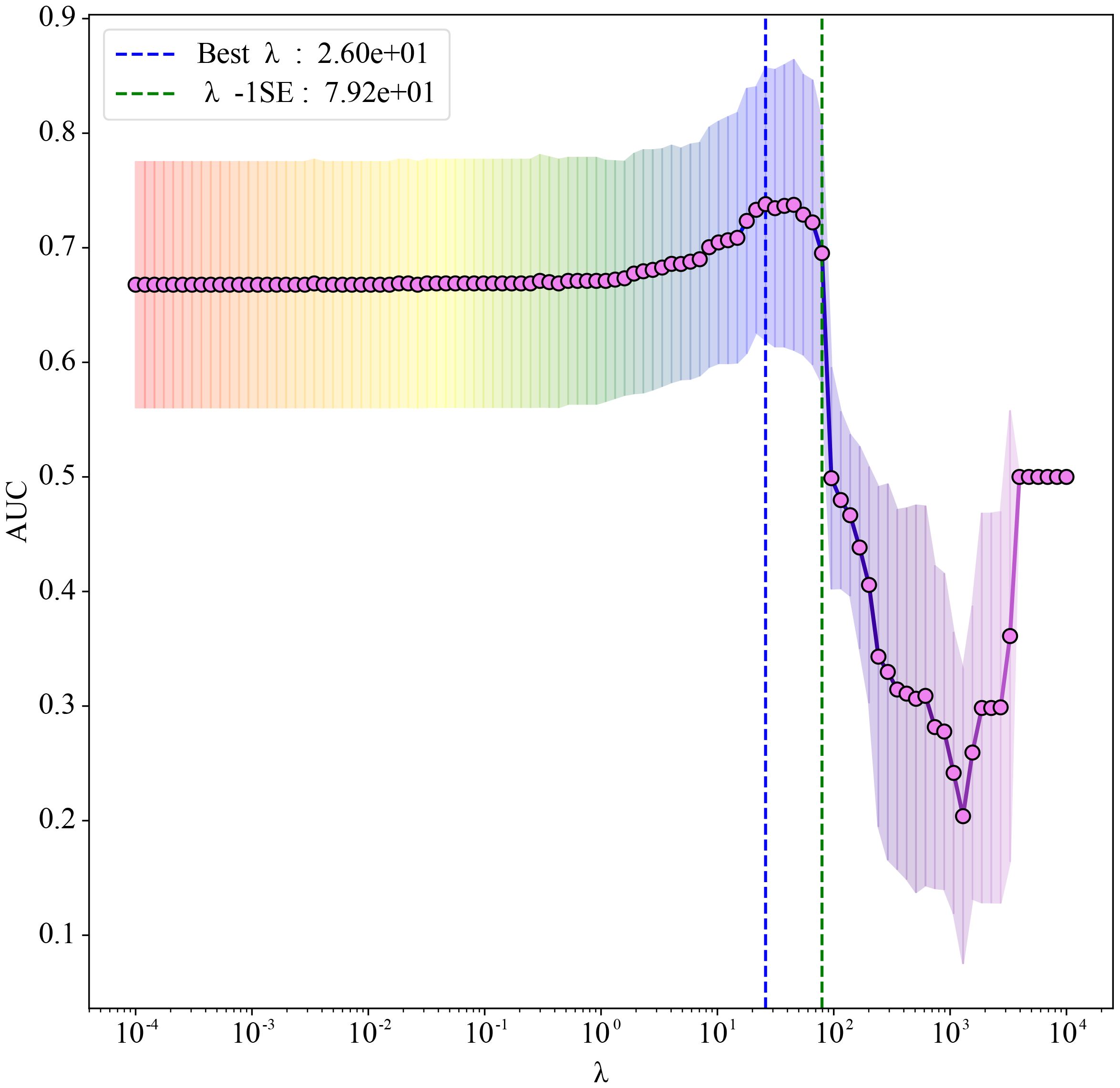 Figure 1. Elastic Net regression coefficient path plot. The abscissa shows λ on a logarithmic scale (larger λ indicates stronger regularization); the ordinate reports the mean area under the receiver operating characteristic (ROC) curve (AUC). Red markers joined by a line represent the mean AUC obtained from three-fold cross-validation at each λ. Grey vertical bars denote ±1 standard error (SE), reflecting variability across folds. The blue dashed line marks the Best λ (λmin = 26), which yields the best mean AUC, whereas the green dashed line marks λ−1SE (79.2); selecting λ−1SE gives a more parsimonious model at negligible loss of discrimination.