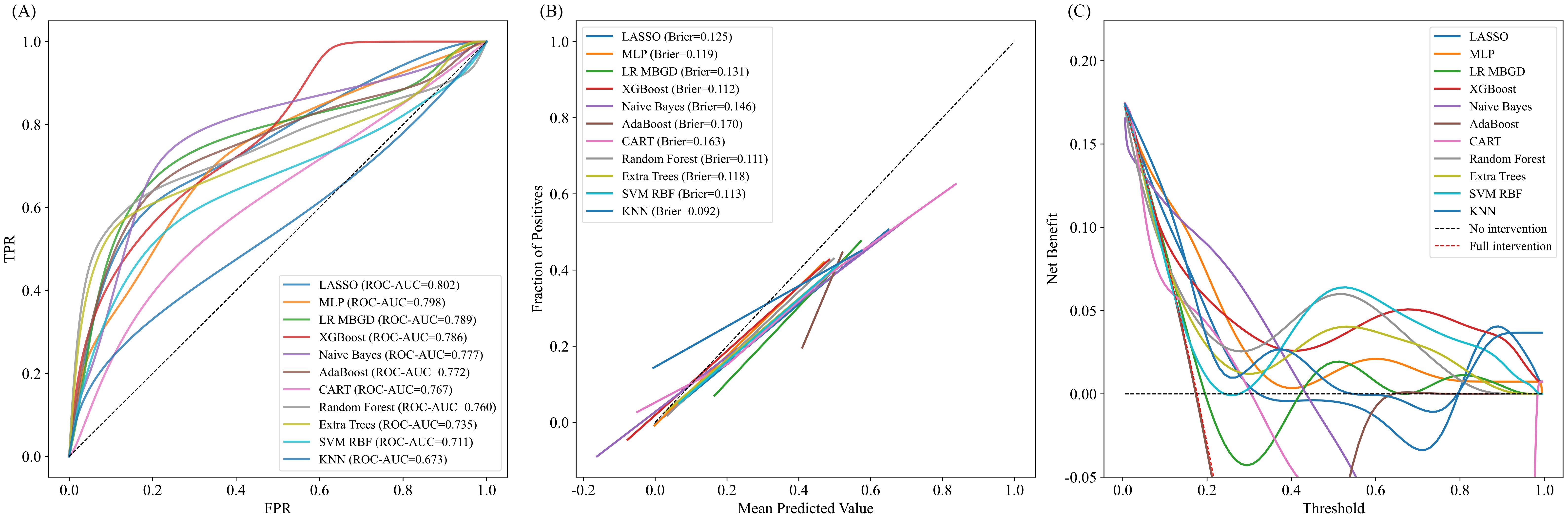 Figure 2. Comprehensive evaluation of predictive models in the external validation cohort. (A) Receiver operating characteristic (ROC) curves of predictive models in the external validation cohort. X-axis: False positive rate (FPR); Y-axis: True positive rate (TPR). The curves show each model’s ability to discriminate between positive and negative outcomes. A curve closer to the top-left corner indicates better performance. The area under the curve (AUC) for each model is reported in the legend. (B) Calibration curves of different models. X-axis: Mean Predicted Value (probability of positive outcome); Y-axis: Fraction of Positives (observed outcome rate). The dashed diagonal line represents perfect calibration. The closer a model’s curve is to this line, the better its predicted probabilities align with observed outcomes. Each model’s Brier score is shown in the legend, with lower scores indicating more accurate calibration. (C) Decision curve analysis (DCA) of different models. X-axis: Threshold probability; Y-axis: Net benefit. The curves assess the clinical utility of each model across a range of threshold probabilities. Dashed lines represent the “no intervention” (black) and “full intervention” (red) strategies. Curves above these lines indicate greater net benefit. FPR, False Positive Rate; TPR, True Positive Rate; LASSO, Least Absolute Shrinkage and Selection Operator; MLP, Multilayer Perceptron; LR MBGD, Logistic Regression trained with Mini-Batch Gradient Descent; XGBoost, Extreme Gradient Boosting; AdaBoost, Adaptive Boosting; CART, Classification and Regression Tree; Extra Trees, Extremely Randomized Trees; SVM RBF, Support Vector Machine with Radial Basis Function kernel; KNN, K-Nearest Neighbors.