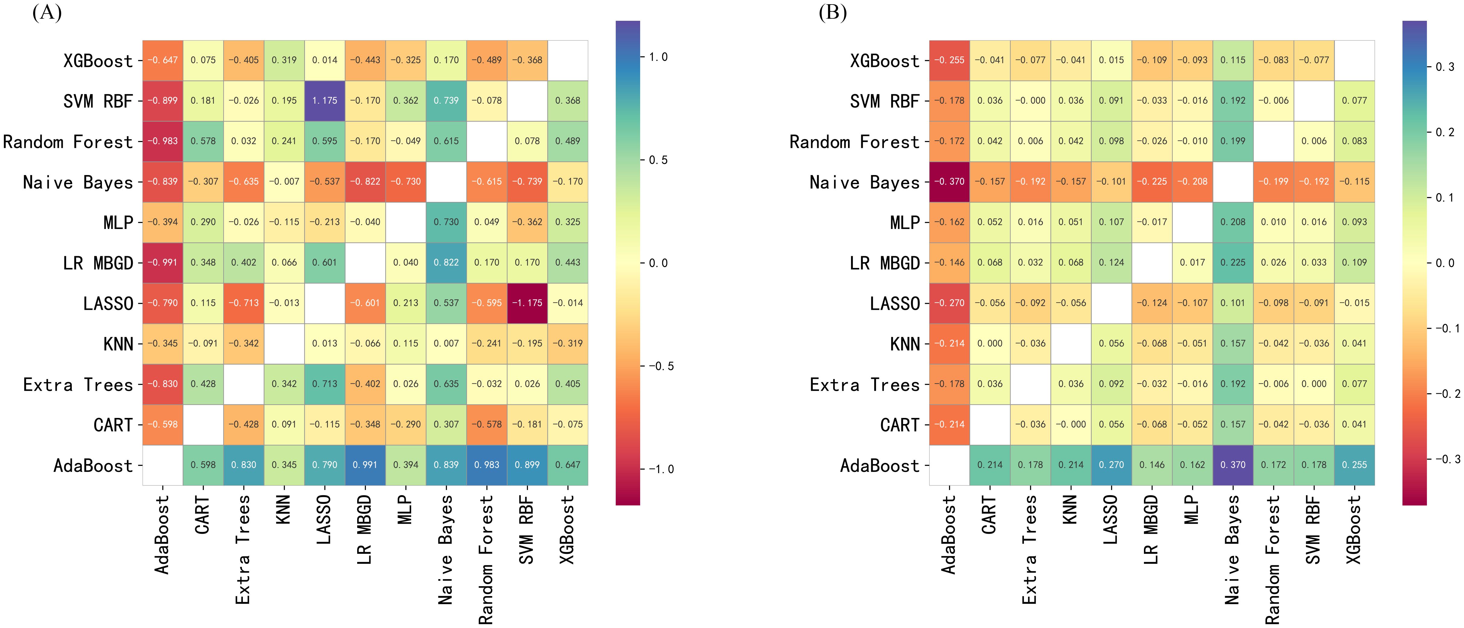 Figure 3. Pairwise reclassification performance of predictive models in the external validation cohort. (A) Pairwise net reclassification improvement (NRI) comparison between models in the external validation cohort. X-axis: Comparator model; Y-axis: Reference model. Each cell displays the NRI value comparing the model on the y-axis with that on the x-axis. Positive values represent better reclassification by the x-axis model. Cooler colors indicate performance gain; warmer colors indicate performance loss. (B) Pairwise integrated discrimination improvement (IDI) comparison between models in the external validation cohort. X-axis: Comparator model; Y-axis: Reference model. Each cell displays the IDI value when comparing the model on the y-axis with the model on the x-axis. Positive values indicate that the x-axis model outperforms the y-axis model in terms of discrimination. Color intensity indicates the magnitude and direction of improvement. XGBoost, Extreme Gradient Boosting; SVM RBF, Support Vector Machine with Radial Basis Function kernel; MLP, Multilayer Perceptron; LR MBGD, Logistic Regression trained with Mini-Batch Gradient Descent; LASSO, Least Absolute Shrinkage and Selection Operator; KNN, K-Nearest Neighbors; Extra Trees, Extremely Randomized Trees; CART, Classification and Regression Tree; AdaBoost, Adaptive Boosting.