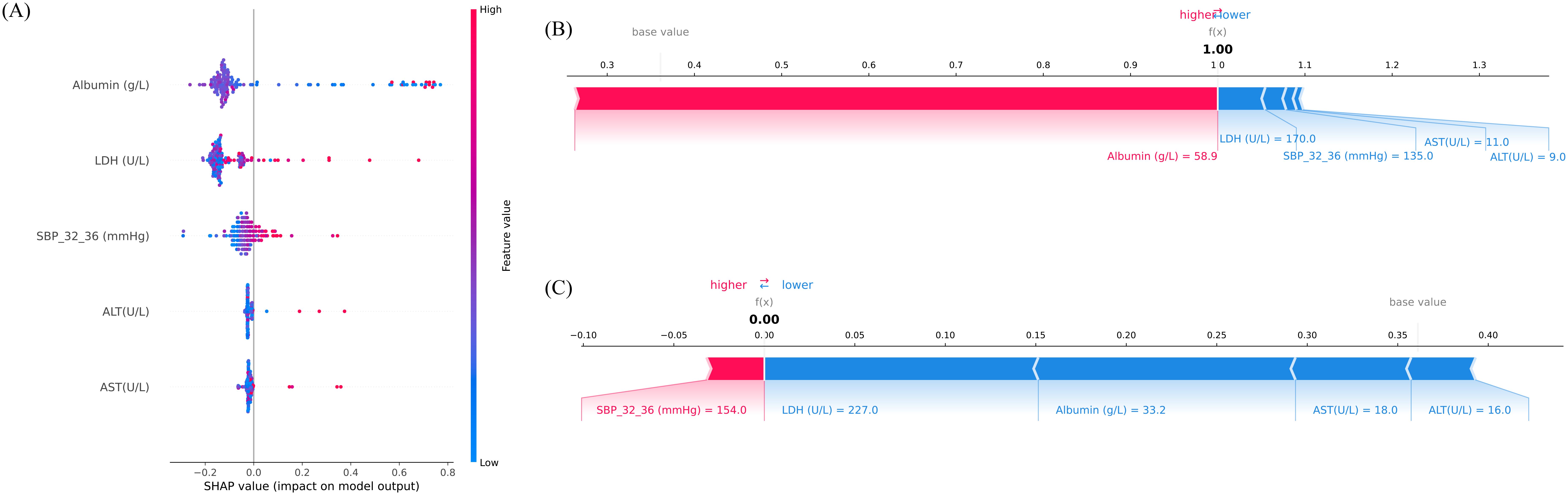 Figure 4. Interpretation of model predictions for preterm birth risk using Shapley additive explanations (SHAP) analysis. (A) SHAP summary plot illustrating the importance and direction of influence of the top five features included in the final model. The x-axis represents SHAP values, which indicate the magnitude and direction of each feature’s contribution to the predicted risk (positive = higher predicted risk, negative = lower predicted risk). The y-axis lists the features ranked by mean absolute SHAP value. The color bar encodes the feature’s original value (red = higher value, blue = lower value). Each point corresponds to an individual sample. (B) SHAP force plot for an individual case with high predicted risk (predicted probability = 1.00). Red segments indicate predictors increasing risk, while blue segments indicate predictors reducing risk. (C) SHAP force plot for an individual case with low predicted risk (predicted probability = 0.00). Blue segments dominate, indicating overall protective contributions. The balance between positive (red) and negative (blue) contributions determines the final prediction output. SBP_32_36, systolic blood pressure measured between 32+0 and 36+6 weeks of gestation. AST, aspartate aminotransferase; ALT, alanine aminotransferase; LDH, lactate dehydrogenase; SBP, systolic blood pressure.