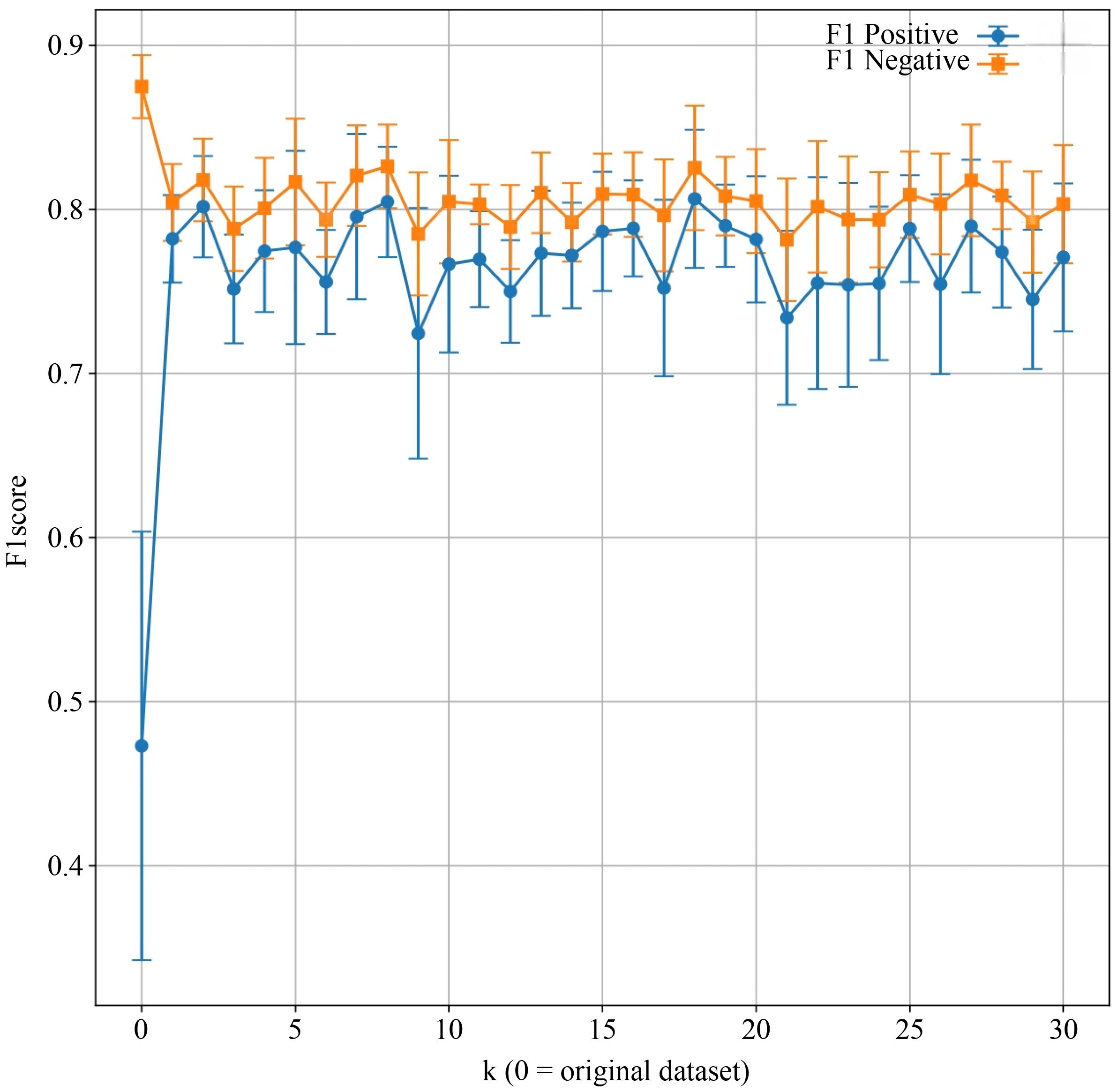 Figure 5. Comparison of model F1 scores before and after applying the Synthetic Minority Over-sampling Technique (SMOTE). X-axis: Number of nearest neighbors parameter k in SVMSMOTE (k = 0 indicates the original dataset); Y-axis: F1 score. Each point represents the mean F1 score across cross-validation folds for positive and negative classes, with error bars indicating standard deviation. The blue line tracks F1 scores for the positive class, while the orange line represents the negative class.