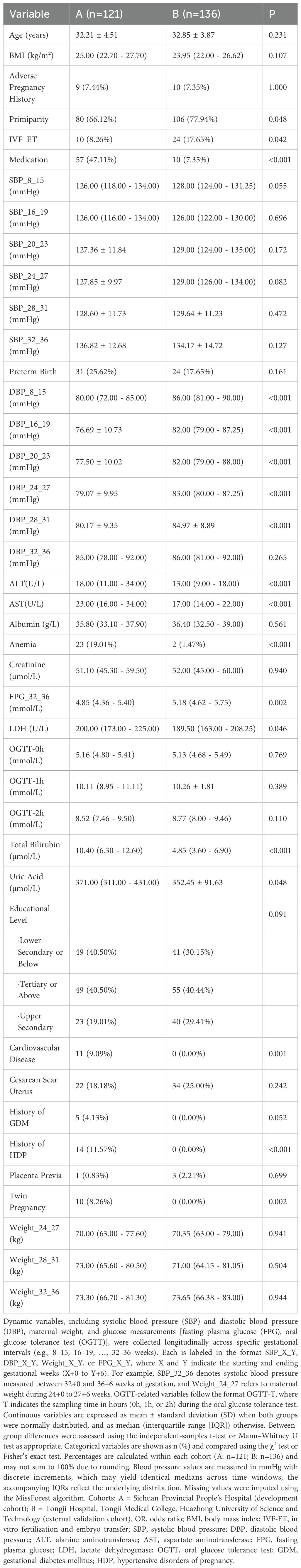 A total of 257 pregnant women diagnosed with GDM and HDP were included in this study. The development cohort comprised 121 cases from Sichuan Provincial People’s Hospital, among whom 31 (25.62%) experienced preterm birth and 90 (74.38%) had non-preterm birth. The external validation cohort included 136 cases from Tongji Hospital, Tongji Medical College, Huazhong University of Science and Technology, among whom 24 (17.65%) experienced preterm birth and 112 (82.35%) had non-preterm birth. Baseline characteristics were compared between the development and validation cohorts to evaluate their population comparability. Significant differences were observed in several key variables, including ALT, AST, Total Bilirubin, and DBP across multiple gestational weeks (8–31 weeks). All P-values were less than 0.001.