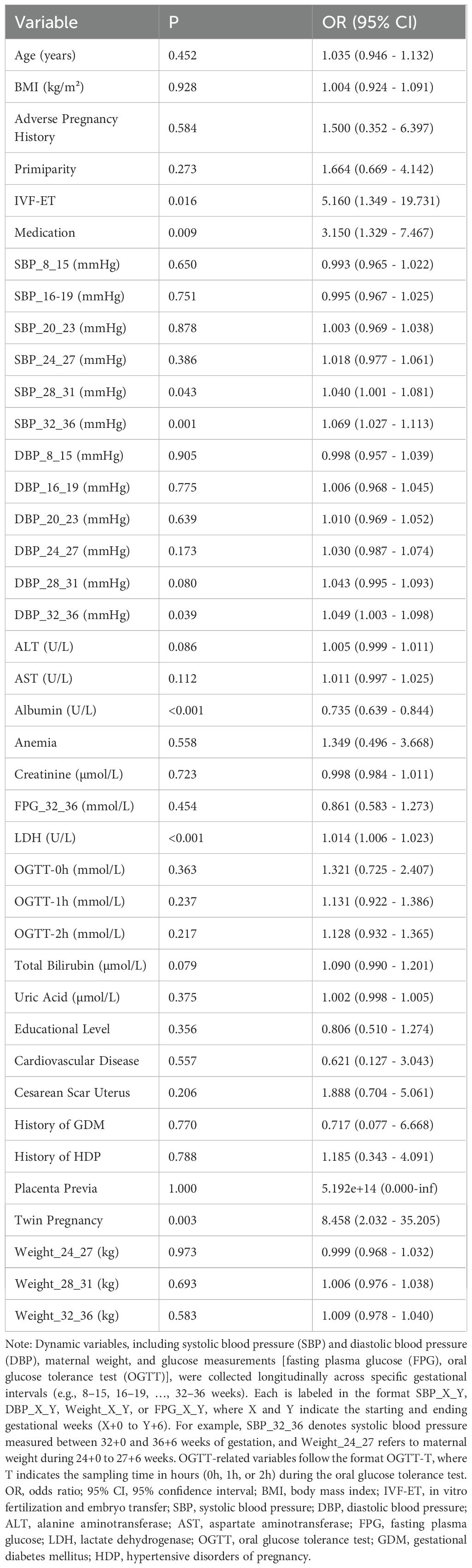 The candidate predictors encompassed several domains: demographic characteristics (Age, body mass index [BMI]) (16); obstetric history (Adverse Pregnancy History and Primiparity) (17, 18); mode of conception (natural conception or in vitro fertilization and embryo transfer [IVF-ET]); pregnancy complications (specifically, the use of antihypertensive medications); and longitudinal measurements of systolic and diastolic blood pressure (SBP and DBP) collected across six gestational intervals: 8 + 0 to 15 + 6, 16 + 0 to 19 + 6, 20 + 0 to 23 + 6, 24 + 0 to 27 + 6, 28 + 0 to 31 + 6, and 32 + 0 to 36 + 6 weeks. Time-specific blood pressure variables were denoted using the format SBP_X_Y or DBP_X_Y, where X_Y indicates the corresponding gestational week range. For example, SBP_32_36 refers to SBP measurements taken between 32 + 0 and 36 + 6 weeks of gestation. Laboratory variables included the mid-pregnancy OGTT (24–28 weeks), with glucose concentrations measured at 0 hours (OGTT-0h), 1 hour (OGTT-1h), and 2 hours (OGTT-2h) after glucose load; liver function markers, including alanine aminotransferase (ALT), aspartate aminotransferase (AST), and lactate dehydrogenase (LDH); as well as Uric Acid, Albumin, and Anemia, totaling more than 30 candidate variables. All variables were collected before the occurrence of outcomes, and outcome data were blinded during data processing to prevent information leakage.