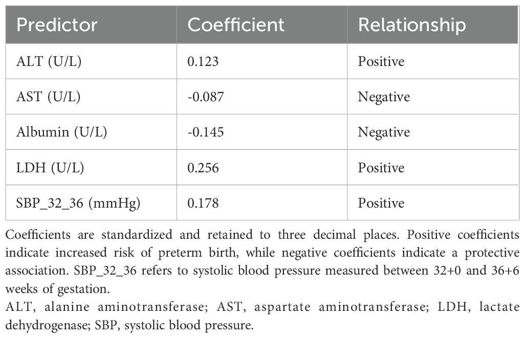 Based on univariate analysis (P < 0.20), thirteen candidate predictors were included in the Elastic Net regression model. To select the optimal features, Elastic Net regression was performed using three-fold cross-validation, and the minimum mean squared error criterion (λ-min) was applied. As a result, five predictors—ALT, AST, Albumin, LDH, and SBP_32_36—were ultimately retained for model development (the antihypertensive medication variable, although initially considered among the candidates, was not retained). The coefficient path is illustrated in Figure 1. Elastic Net regression retained a set of predictors that were most informative for preterm birth risk. The selected predictors, together with their regression coefficients and direction of association, are summarized in Table 3. These coefficients reflect the relative importance of each predictor within the penalized regression framework, where larger absolute values indicate stronger contributions to the model.