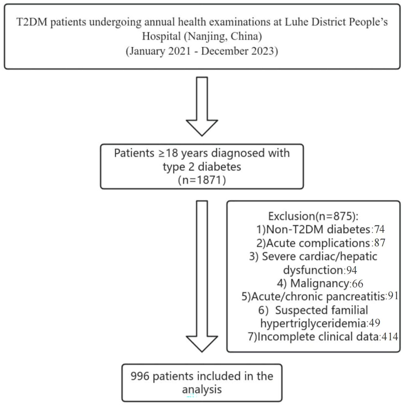 Flowchart of T2DM patient selection at Luhe District People’s Hospital, Nanjing, China, from January 2021 to December 2023. Out of 1,871 patients aged 18 or older with type 2 diabetes, 875 were excluded due to non-T2DM diabetes, acute complications, severe cardiac/hepatic dysfunction, malignancy, pancreatitis, suspected familial hypertriglyceridemia, or incomplete clinical data. 996 patients were included in the analysis.