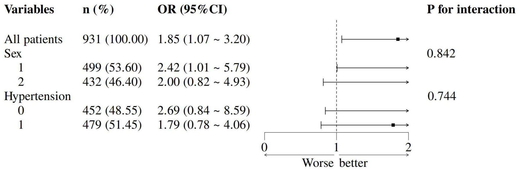 Forest plot showing odds ratios (OR) and confidence intervals (CI) for different variables. For all patients (n=931), OR is 1.85 (CI: 1.07-3.20). Sex: group 1 (n=499), OR is 2.42 (CI: 1.01-5.79); group 2 (n=432), OR is 2.00 (CI: 0.82-4.93). Hypertension: group 0 (n=452), OR is 2.69 (CI: 0.84-8.59); group 1 (n=479), OR is 1.79 (CI: 0.78-4.06). P-values for interaction are 0.842 and 0.744. Horizontal lines illustrate CI, with a dashed vertical line at 1.0 indicating no effect.