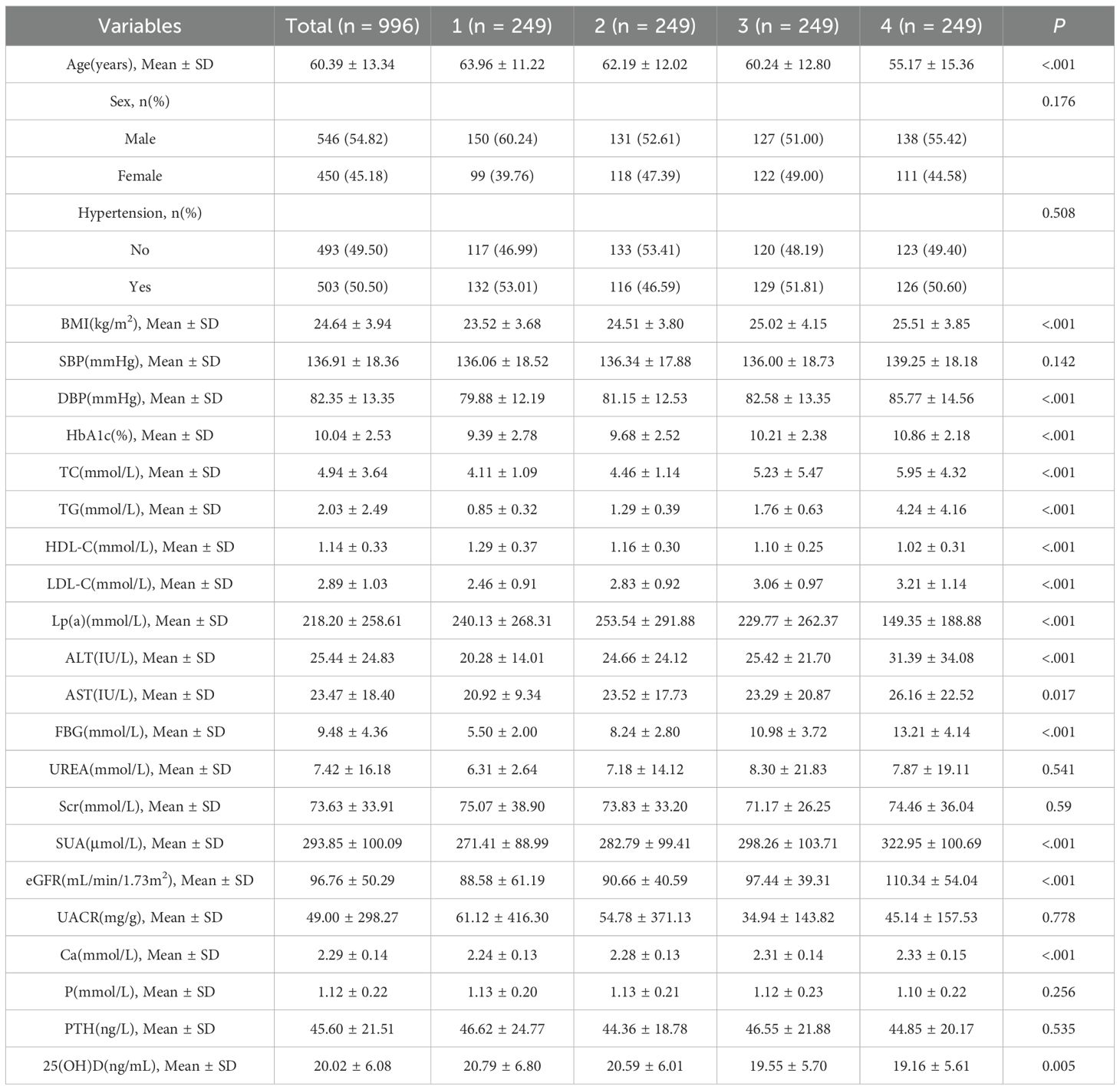 The cohort (*n* = 996) had a mean age of 60.39 ± 13.34 years; 54.82% were male. Higher TyG quartiles were associated with younger age, elevated BMI, blood pressure, HbA1c, LDL-C, liver enzymes, FBG, uric acid, eGFR, and calcium, but lower HDL-C and 25(OH)D (P < 0.05; Table 1).