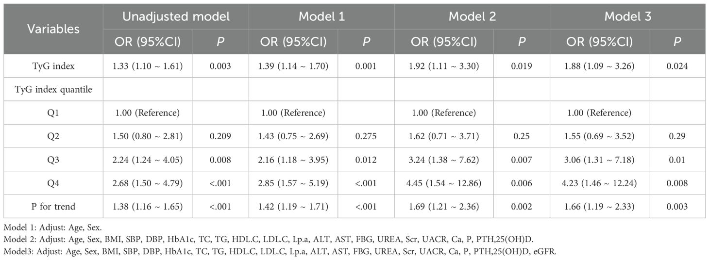 Logistic regression results are presented in Table 2. Logistic regression analyses(Crude model) demonstrated a consistent positive association between the TyG index and HUA: Each unit increase in TyG index was associated with a 33% elevated risk of HUA (OR = 1.33, 95% CI: (1.10 ~ 1.61)). Adjusted models:Model 1 (adjusted for age and sex): Higher TyG index significantly increased HUA risk (OR = 2.85, 95% CI: 1.57–5.19; P < 0.001).Model 2 (Model 1 + BMI, SBP, DBP, HbA1c, lipids, liver enzymes, renal markers, minerals, 25(OH)D): Participants in the highest TyG quartile had a 4.45-fold higher HUA risk versus the lowest quartile (OR = 4.45, 95% CI: 1.54–12.86; P = 0.006).Model 3 (Model 2 + eGFR): The association persisted (Q4 vs. Q1: OR = 4.23, 95% CI: 1.46–12.24; P = 0.008).Key conclusion: The TyG index remained an independent predictor of HUA risk after multivariable adjustment, with progressively increasing risk across ascending TyG quartiles.